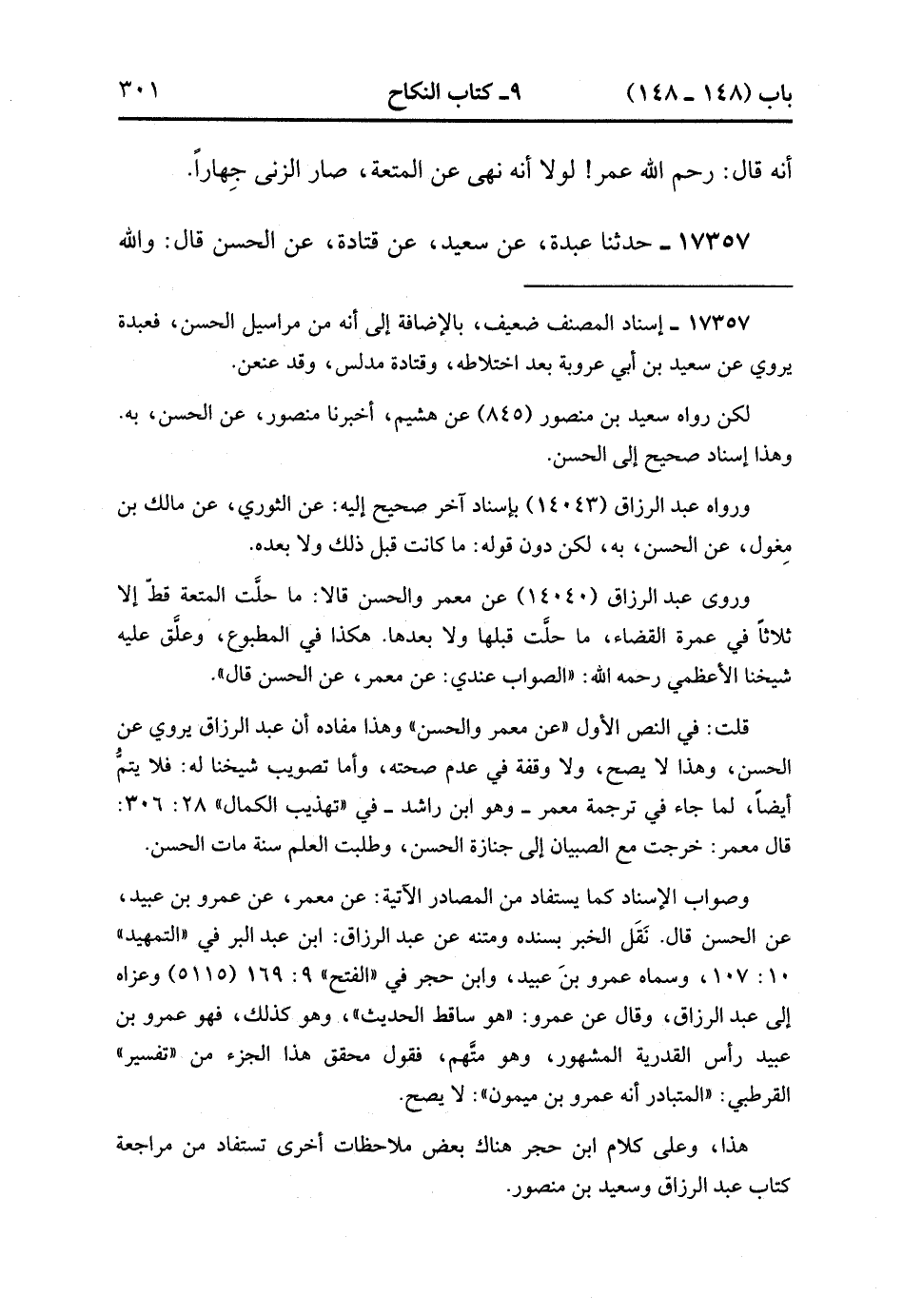 17356- حَدَّثَنَا عَبدَة , عَنْ سَعِيدٍ , عَنْ قَتَادَةَ , عَنْ سَعِيدِ بْنِ الْمُسَيَّبِ أَنَّهُ قَالَ : رَحِمَ اللَّهُ عُمَرَ ، لَوْلاَ إِنَّهُ نَهَى , عَنِ الْمُتْعَةِ صَارَ الزِّنَا جِهَارًا.