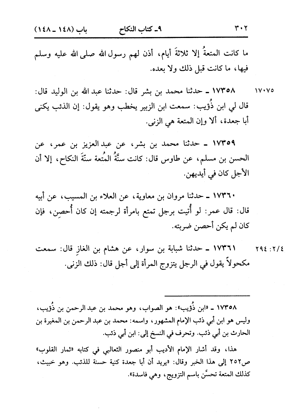 17358- حَدَّثَنَا مُحَمَّدُ بْنُ بِشْرٍ ، قَالَ : حَدَّثَنِي عَبْدُ اللهِ بْنُ الْوَلِيدِ ، قَالَ : قَالَ لِي ابْنُ ذُؤَيبٍ : سَمِعْتُ ابْنَ الزُّبَيْرِ يَخْطُبُ وَهُوَ يَقُولُ : إنَّ الذِّئْبَ يُكَنَّى أَبَا جَعْدَةَ ، أَلاَ وَإِنَّ الْمُتْعَةَ هِيَ الزِّنَا.