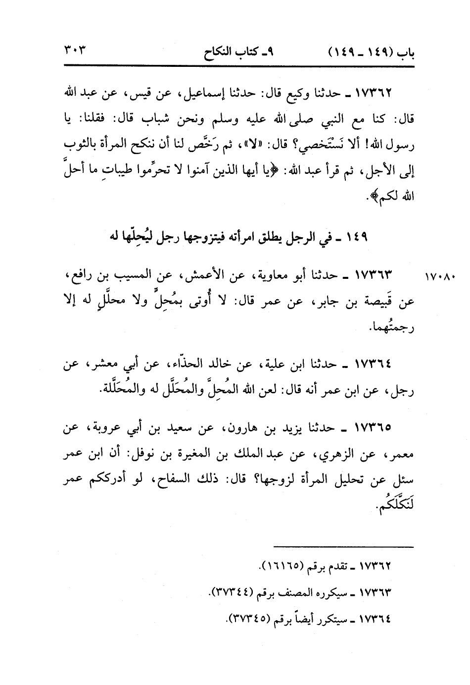 17365- حَدَّثَنَا يَزِيدُ بْنُ هَارُونَ , عَنْ سَعِيدِ بْنِ أَبِي عَرُوبَةَ , عَنْ مَعْمَرٍ , عَنِ الزُّهْرِيِّ , عَنْ عَبْدِ الْمَلِكِ بْنِ الْمُغِيرَةِ بْنِ نَوْفَلٍ أَنَّ ابْنَ عُمَرَ سُئِلَ عَنْ تَحْلِيلِ الْمَرْأَةِ لِزَوْجِهَا قَالَ : ذَلِكَ السِّفَاحُ ، لَوْ أَدْرَكَكُمْ عُمَرُ لَنَكَّلَكُمْ. (4/294:2).
