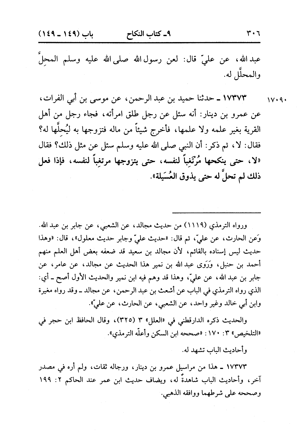 17373- حَدَّثَنَا حُمَيْدُ بْنُ عَبْدِ الرَّحْمَنِ , عَنْ مُوسَى بْنِ أَبِي الْفُرَاتِ , عَنْ عَمْرِو بْنِ دِينَارٍ أنَّهُ سُئِلَ عَنْ رَجُلٍ طَلَّقَ امْرَأَتَهُ فَجَاءَ رَجُلٌ مِنْ أَهْلِ الْقَرْيَةِ بِغَيْرِ عِلْمِهِ وَلاَ عِلْمِهَا فَأَخْرَجَ شَيْئًا مِنْ مَالِهِ فَتَزَوَّجَهَا به لِيُحِلَّهَا لَهُ , فَقَالَ : لاَ ، ثُمَّ ذَكَرَ أَنَّ النَّبِيَّ صَلَّى الله عَلَيْهِ وَسَلَّمَ سُئِلَ عَنْ مِثْلِ ذَلِكَ , فَقَالَ : لاَ حَتَّى يَنْكِحَهَا مُرْتَغِِبًا لِنَفْسِهِ ، حَتَّى يَتَزَوَّجَهَا مُرْتَغِِبًا لِنَفْسِهِ , فَإِذَا فَعَلَ ذَلِكَ لَمْ تَحِلَّ لَهُ حَتَّى يذُوقَ الْعُسَيْلَةَ. (4/295:2).