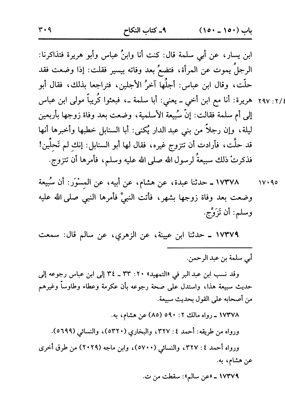 17379- حَدَّثَنَا ابْنُ عُيَيْنَةَ , عَنِ الزُّهْرِيِّ , عَنْ سَالِمٍ ، قَالَ : قَالَ : سَمِعْتُ رَجُلاً مِنَ الأَنْصَارِ يُحَدِّثُ ابْنَ عُمَرَ يَقُولُ : سَمِعْتُ أَبَاك يَقُولُ : لَوْ وَضَعَتِ الْمُتَوَفَّى عَنْهَا زَوْجُهَا ذَا بَطْنِهَا وَهُوَ عَلَى السَّرِيرِ فَقَدْ حَلَّتْ. (4/297:2).