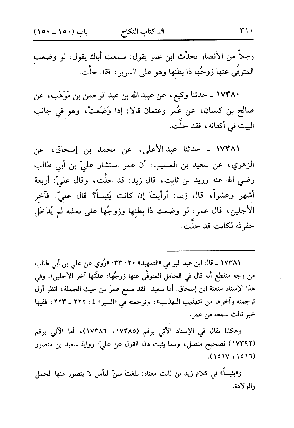 17381- حَدَّثَنَا عَبْدِ الأَعْلَى , عَنْ مُحَمَّدِ بْنِ إِسْحَاقَ , عَنِ الزُّهْرِيِّ , عَنْ سَعِيدِ بْنِ الْمُسَيَّبِ أَنَّ عُمَرَ اسْتَشَارَ عَلِيَّ بْنَ أَبِي طَالِبٍ رَضِيَ الله عَنْهُ وَزَيْدَ بْنَ ثَابِتٍ قَالَ زَيْدٌ : قدْ حَلَّتْ وَقَالَ عَلِيٌّ : أَرْبَعَةَ أَشْهُرٍ وَعَشْرًا قَالَ زَيْدٌ : أَرَأَيْتَ إِنْ كَانَتْ يَئيسًا قَالَ عَلِيُّ : فَآخِرُ الأَجَلَيْنِ قَالَ عُمَرُ : لَوْ وَضَعَتْ ذَا بَطْنِهَا وَزَوْجُهَا عَلَى نَعْشِهِ لَمْ يَدْخُلْ حُفْرَتَهُ لَكَانَتْ قَدْ حَلَّتْ. (4/297:2).