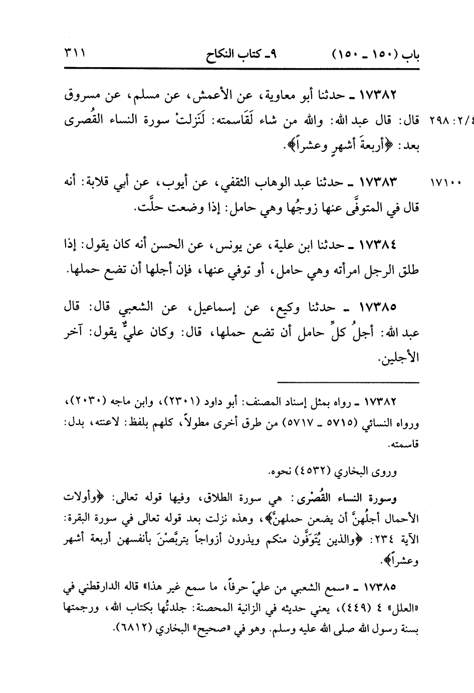 17385- حَدَّثَنَا وَكِيعٌ , عَنْ إسْمَاعِيلَ , عَنِ الشَّعْبِيِّ ، قَالَ : قَالَ عَبْدُ اللهِ : أَجَلُ كُلِّ حَامِلٍ أَنْ تَضَعَ حَمْلَهَا قَالَ : وَكَانَ عَلِيٌّ يَقُولُ : آخِرُ الأَجَلَيْنِ. (4/298:2).