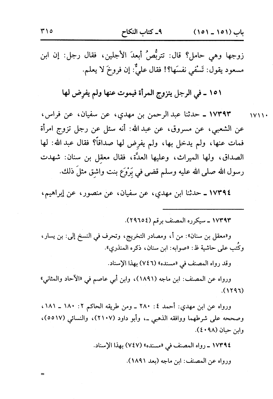 17394- حَدَّثَنَا ابْنُ مَهْدِيٍّ , عَنْ سُفْيَانَ , عَنْ مَنْصُورٍ , عَنْ إبْرَاهِيمَ , عَنْ عَلْقَمَةَ , عَنْ عَبْدِ اللهِ : مِثْلَهُ. (4/300:2).