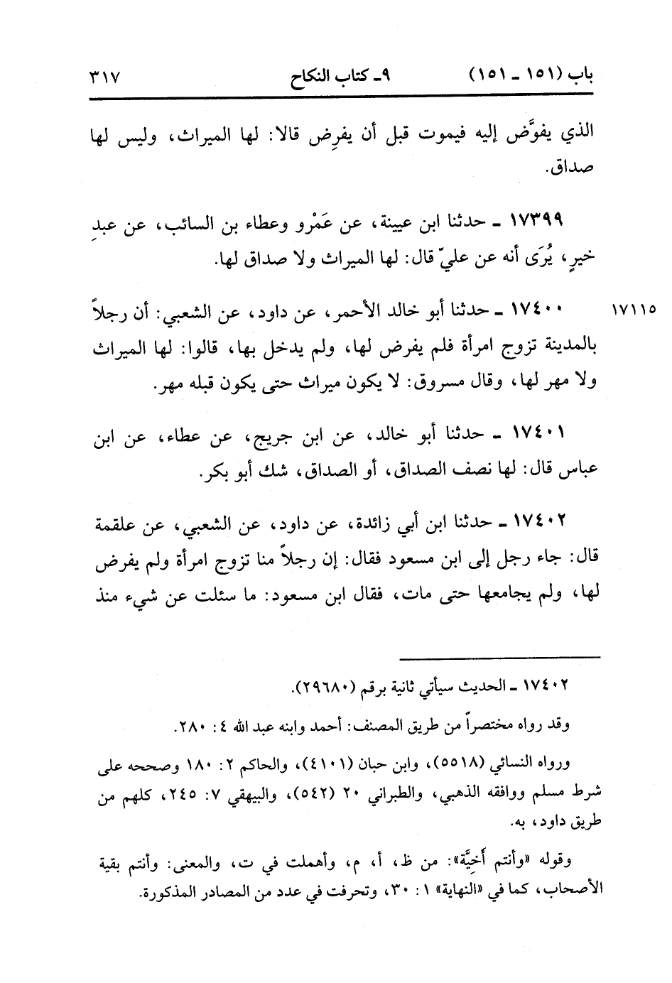 17402- حَدَّثَنَا ابْنُ أَبِي زَائِدَةَ , عَنْ دَاوُدَ , عَنِ الشَّعْبِيِّ , عَنْ عَلْقَمَةَ قَالَ : جَاءَ رَجُلٌ إلَى ابْنِ مَسْعُودٍ , فَقَالَ : إنَّ رَجُلاً مِنَّا تَزَوَّجَ امْرَأَةً وَلَمْ يَفْرِضْ لَهَا وَلَمْ يُجَامِعْهَا حَتَّى مَاتَ , فَقَالَ ابْنُ مَسْعُودٍ : مَا سُئِلْت عَنْ شَيْءٍ مُنْذُ فَارَقْت النَّبِيَّ صَلَّى الله عَلَيْهِ وَسَلَّمَ أَشَدَّ عَلَيَّ مِنْ هَذَا ، سَلُوا غَيْرِي فَتَرَدَّدُوا فِيهَا شَهْرًا قَالَ : فَقَالَ : مَنْ أَسْأَلُ وَأَنْتُمْ أَخِيَّةُ أَصْحَابِ مُحَمَّدٍ بِهَذَا الْبَلَدِ ؟ فَقَالَ : سَأَقُولُ فِيهَا بِرَأْيِي فَإِنْ يَكُنْ صَوَابًا فَمِنَ اللهِ , وَإِنْ يَكُنْ خَطَأً فَمِنِّي وَمِنَ الشَّيْطَانِ ، أَرَى أَنَّ لَهَا مَهْرَ نِسَائِهَا لاَ وَكْسَ وَلاَ شَطَطَ وَلَهَا الْمِيرَاثُ وَعَلَيْهَا عِدَّةُ الْمُتَوَفَّى عَنْهَا زَوْجُهَا , فَقَالَ : نَاسٌ مِنْ أَشْجَعَ : نَشْهَدُ أَنَّ رَسُولَ اللهِ صَلَّى الله عَلَيْهِ وَسَلَّمَ قَضَى مِثْلَ الَّذِي قَضَيْت فِي امْرَأَةٍ مِنَّا يُقَالُ لَهَا بِرْوَعُ ابْنَةُ وَاشِقٍ قَالَ : فَمَا رَأَيْتُ ابْنَ مَسْعُودٍ فَرِحَ بِشَيْءٍ مَا فَرِحَ يَوْمَئِذٍ بِهِ. (4/301:2).