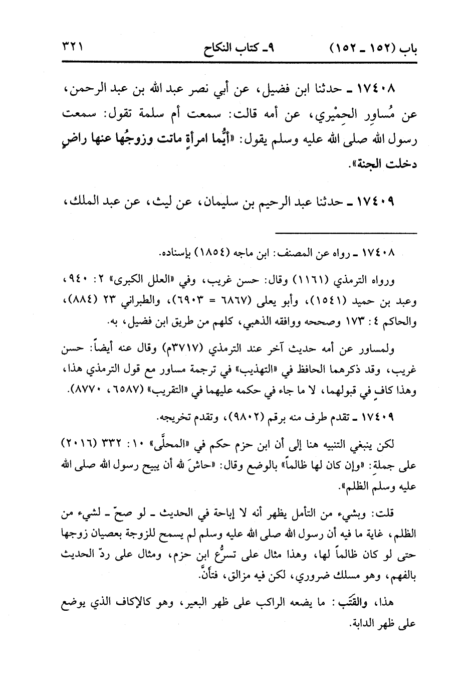 17408- حَدَّثَنَا ابْنُ فُضَيْلٍ , عَنْ أَبِي نَصْرٍ عَبْدِ اللهِ بْنِ عَبْدِ الرَّحْمَنِ , عَنْ مُسَاوِرٍ الْحِمْيَرِيِّ , عَنْ أُمهِ قَالَت : سَمِعْتُ أُمَّ سَلَمَةَ تَقُولُ : سَمِعْتُ رَسُولَ اللهِ صَلَّى الله عَلَيْهِ وَسَلَّمَ يَقُولُ : أَيُّمَا امْرَأَةٍ مَاتَتْ وَزَوْجُهَا عَنْهَا رَاضٍ دَخَلَتِ الْجَنَّةَ. (4/303:2).