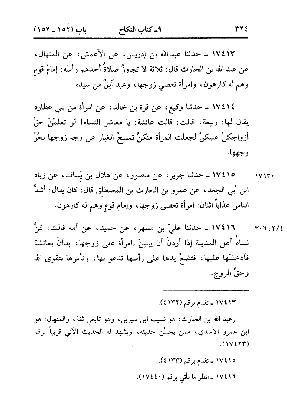 17415- حَدَّثَنَا جَرِيرٌ , عَنْ مَنْصُورٍ , عَنْ هِلاَلِ بْنِ يَِسَافٍ , عَنْ زِيَادِ بْنِ أَبِي الْجَعْدِ , عَنْ عَمْرِو بْنِ الْحَارِثِ بْن الْمُصْطَلِقِ قَالَ : كَانَ يُقَالُ : أَشَدُّ النَّاسِ عَذَابًا اثْنَانِ : امْرَأَةٌ تَعْصِي زَوْجَهَا وَإِمَامُ قوْمٍ وَهُمْ لَهُ كَارِهُونَ.