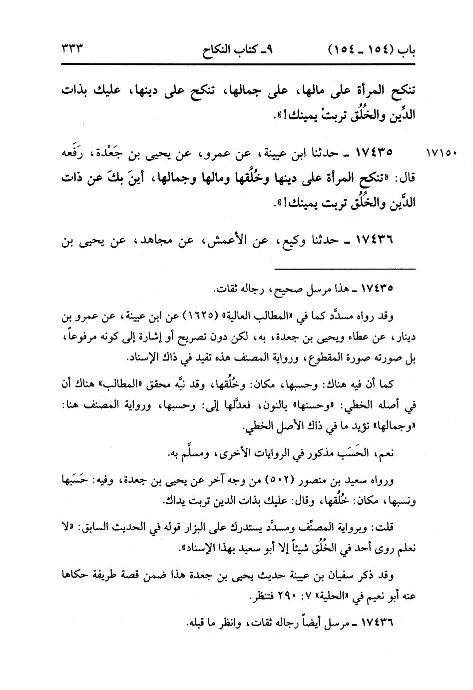 17436- حَدَّثَنَا وَكِيعٌ , عَنِ الأَعْمَشِ , عَنْ مُجَاهِدٍ , عَنْ يَحْيَى بْنِ جَعْدَةَ ، قَالَ : قَالَ رَسُولُ اللهِ صَلَّى الله عَلَيْهِ وَسَلَّمَ : تُنْكَحُ الْمَرْأَةُ عَلَى مَالِهَا وَعَلَى حَسَبِهَا وَعَلَى جَمَالِهَا وَعَلَى دِينِهَا فَعَلَيْكَ بِذَاتِ الدِّينِ ، تَرِبَتْ يَمِينُكَ. (4/311:2).