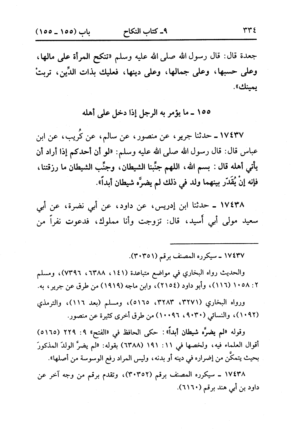 17437- حدَّثَنَا جَرِيرٌ , عَنْ مَنْصُورٍ , عَنْ سَالِمٍ , عَنْ كُرَيْبٍ , عَنِ ابْنِ عَبَّاسٍ ، قَالَ : قَالَ رَسُولُ اللهِ صَلَّى الله عَلَيْهِ وَسَلَّمَ : لَوْ أَنَّ أَحَدَكُمْ إذَا أَرَادَ أَنْ يَأْتِيَ أَهْلَهُ قَالَ : بِسْمِ اللهِ اللَّهُمَّ جَنِّبْنَا الشَّيْطَانَ وَجَنِّبَ الشَّيْطَانَ مَا رَزَقْتنَا ، فَإِنَّهُ إِنْ يُقْدَرْ بَيْنَهُمَا وَلَدٌ فِي ذَلِكَ لَمْ يَضُرَّهُ شَيْطَانٌ أَبَدًا.