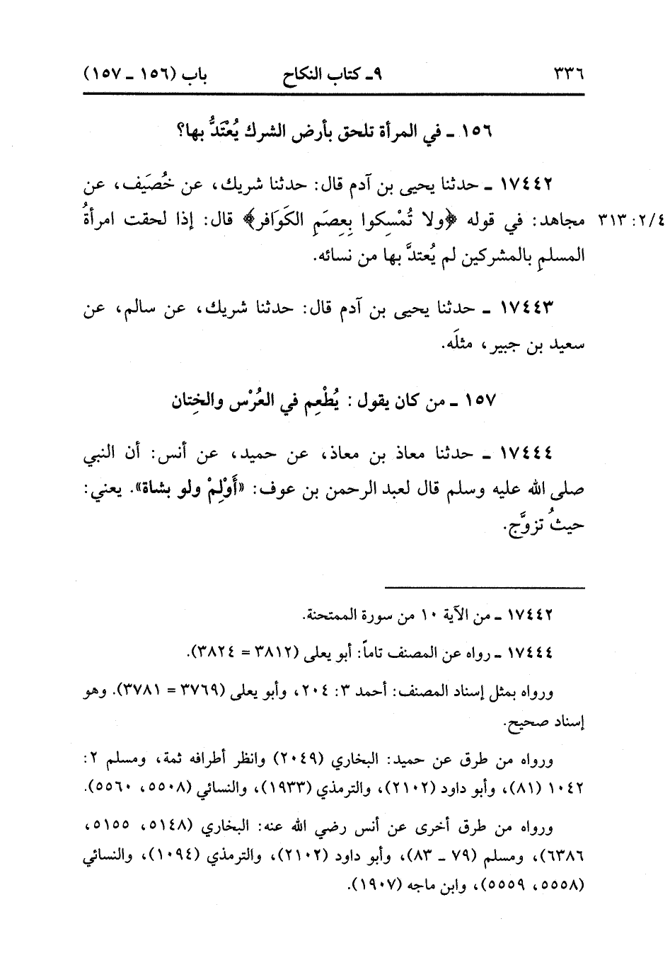 17444- حَدَّثَنَا مُعَاذُ بْنُ مُعَاذٍ , عَنْ حُمَيْدٍ , عَنْ أَنَسٍ أَنَّ النَّبِيَّ صَلَّى الله عَلَيْهِ وَسَلَّمَ قَالَ لِعَبْدِ الرَّحْمَنِ بن عوف : أَوْلِمْ وَلَوْ بِشَاةٍ ، يَعْنِي , حِينَ تَزَوَّجَ. (4/313:2).