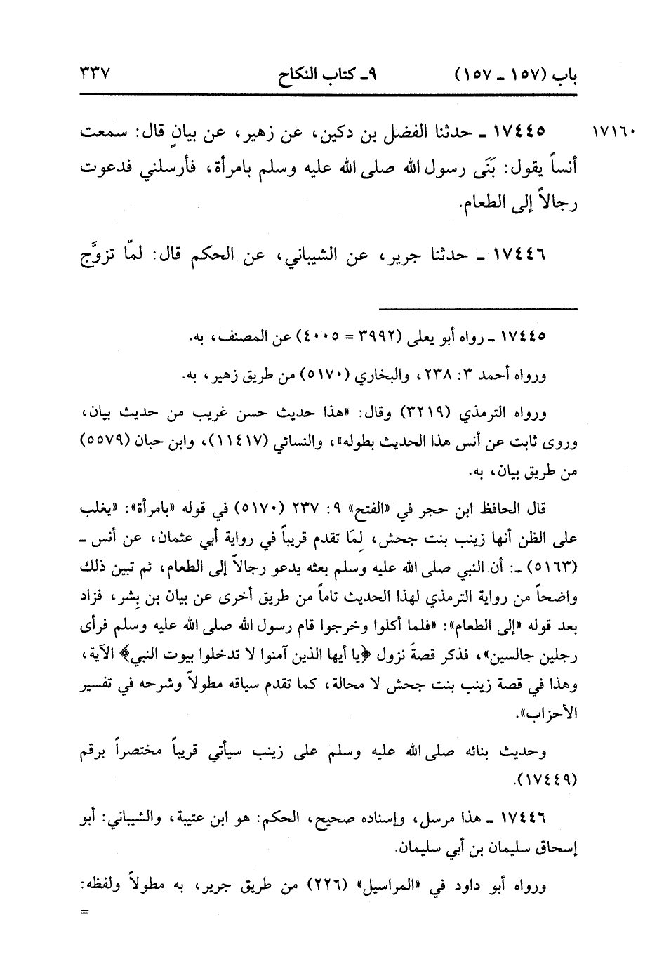 17445- حَدَّثَنَا الْفَضْلُ بْنُ دُكَيْنٍ , عَنْ زُهَيْرٍ , عَنْ بَيَانٍ ، قَالَ : سَمِعْتُ أَنَسًا يَقُولُ : بَنَى رَسُولُ اللهِ صَلَّى الله عَلَيْهِ وَسَلَّمَ بِامْرَأَةٍ فَأَرْسَلَنِي فَدَعَوْتُ رِجَالاً إلَى الطَّعَامِ. (4/313:2).