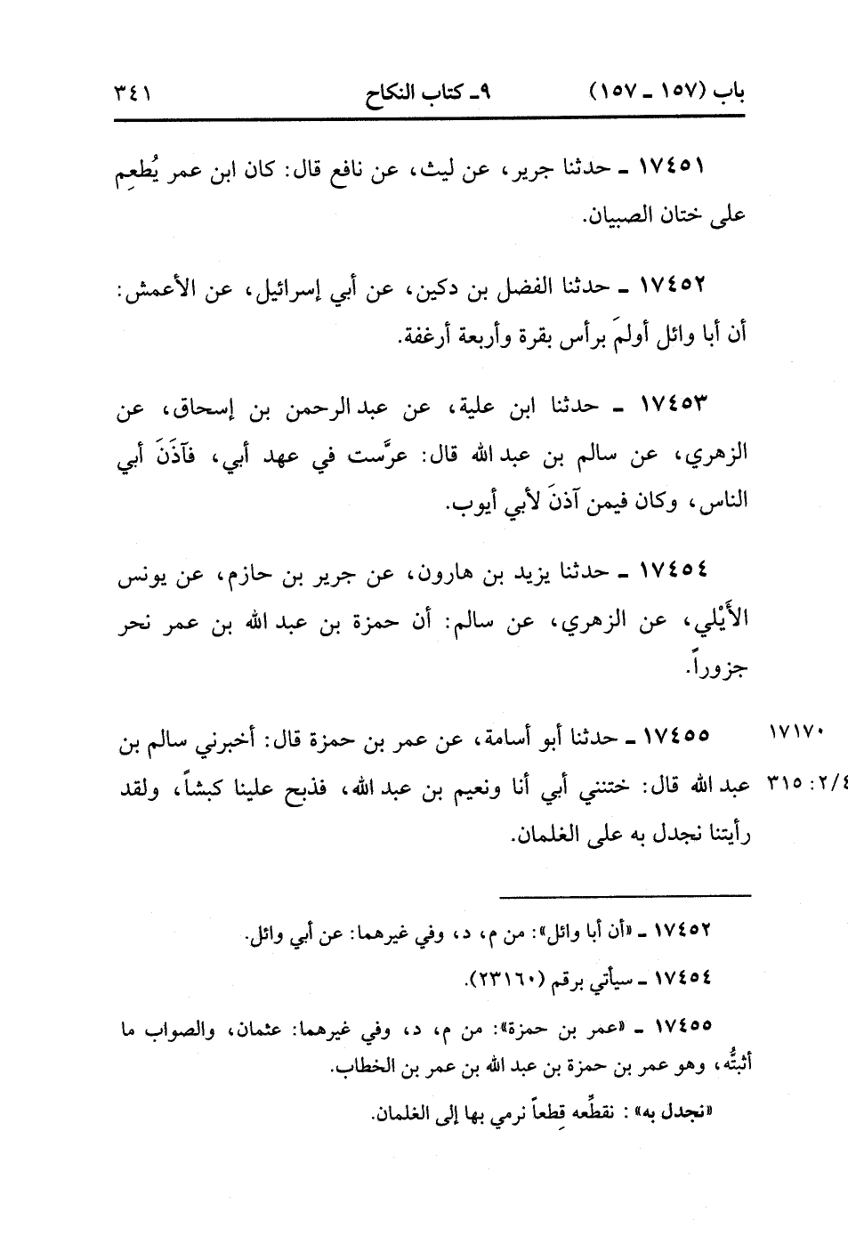 17455- حَدَّثَنَا أَبُو أُسَامَةَ , عَنْ عُمَرَ بْنِ حَمْزَةَ قَالَ : أَخْبَرَنِي سَالِمُ بْنُ عَبْدِ اللهِ قَالَ : خَتَنَنِي أَبِي أَنَا وَنُعَيْمَ بْنَ عَبْدِ اللهِ فَذَبَحَ عَلَيْنَا كَبْشًا وَلَقَدْ رَأَيْتُنَا نَجْدِلُ بِهِ عَلَى الْغِلْمَانِ. (4/314:2).