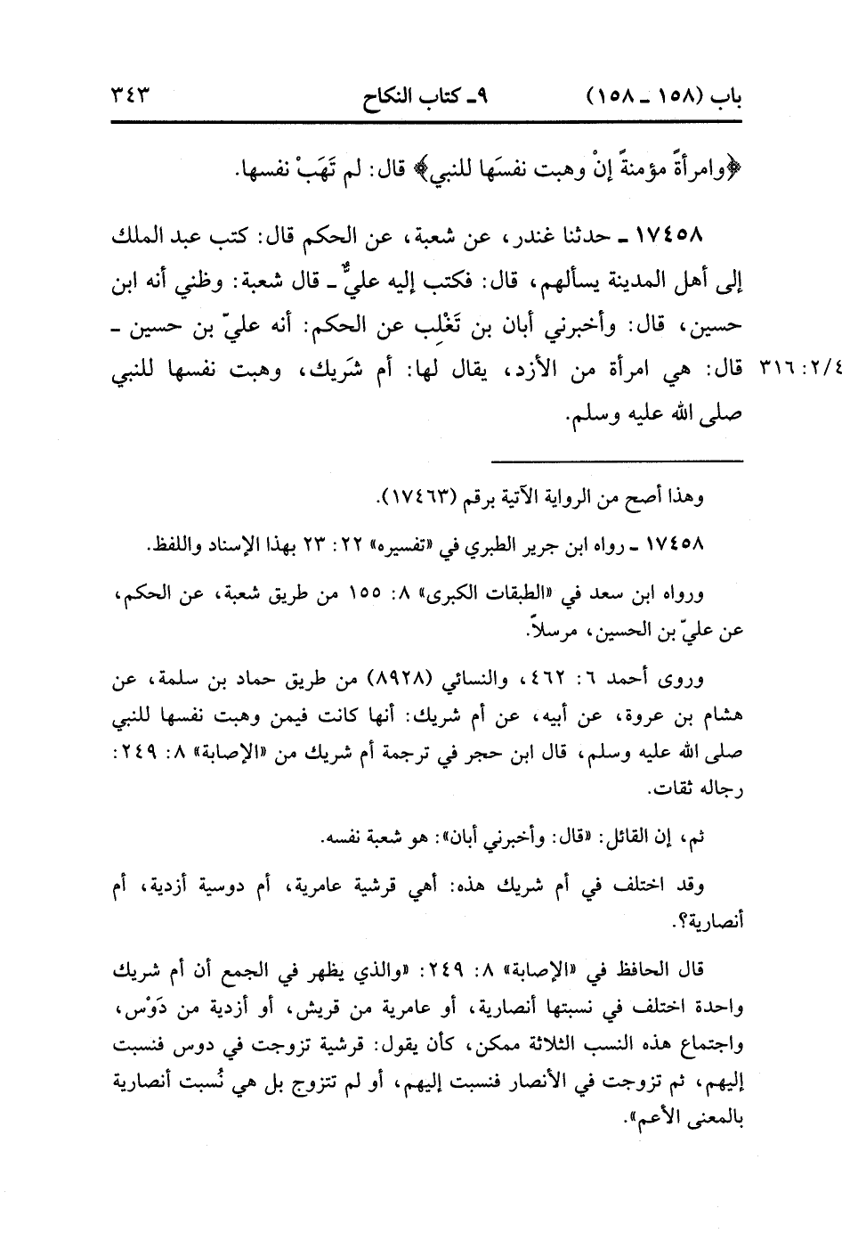 17458- حَدَّثَنَا غُنْدَرٌ , عَنْ شُعْبَةَ , عَنِ الْحَكَمِ قَالَ : كَتَبَ عَبْدُ الْمَلِكِ إلَى أَهْلِ الْمَدِينَةِ يَسْأَلُهُمْ قَالَ : فَكَتَبَ إلَيْهِ عَلِيٌّ قَالَ شُعْبَةُ : وَظَنِّي أَنَّهُ ابْنُ حُسَيْنٍ قَالَ : وَأَخْبَرَنِي أَبَانُ بْنُ تَغْلِبَ , عَنِ الْحَكَمِ أَنَّهُ عَلِيُّ بْنُ حُسَيْنٍ قَالَ : هِيَ امْرَأَةٌ مِنَ الأَزْدِ يُقَالُ لَهَا أَمُّ شَرِيكٍ وَهَبَتْ نَفْسَهَا لِلنَّبِيِّ صَلَّى الله عَلَيْهِ وَسَلَّمَ. (4/315:2).