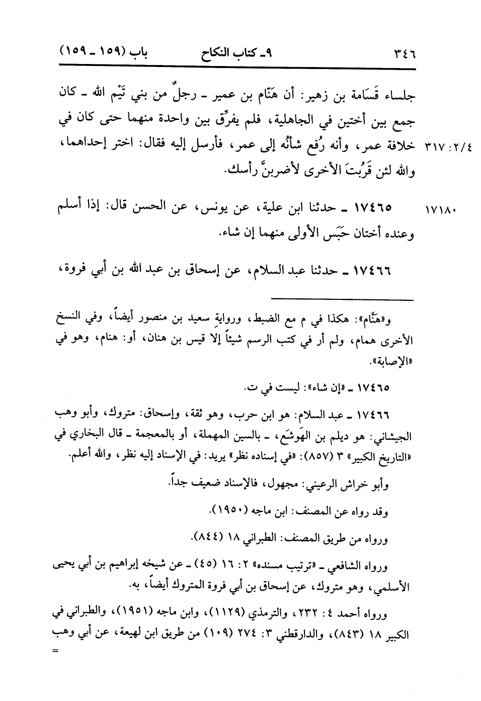 17464- حدَّثَنَا ابْنُ عُلَيَّةَ , عَنْ عَوْفٍ , قَالَ : حدَّثَنَا أَشْيَاخُ عُمَرِيِين مِنْ جُلَسَاءِ قَسَامَةَ بْنِ زُهَيْرٍ أَنَّ هَمَّامَ بْنَ عُمَيْرٍ رَجُلٌ مِنْ بَنِي تَيْمِ اللهِ كَانَ جَمَعَ بَيْنَ أُخْتَيْنِ فِي الْجَاهِلِيَّةِ فَلَمْ يُفَرِّقْ بَيْنَ وَاحِدَةٍ مِنْهُمَا حَتَّى كَانَ فِي خِلاَفَةِ عُمَرَ وَأَنَّهُ رُفِعَ شَأْنُهُ إلَى عُمَرَ فَأَرْسَلَ إلَيْهِ , فَقَالَ : اخْتَرْ إحْدَاهُمَا وَاللَّهِ لَئِنْ قَرَبْتِ الأُخْرَى لأَضْرِبَنَّ رَأْسَكَ. (4/316:2)