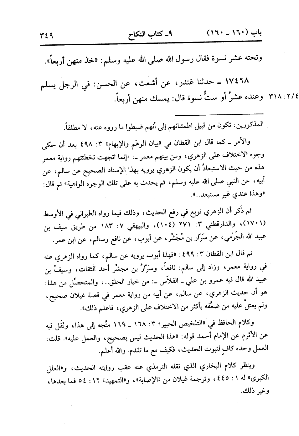 17468- حَدَّثَنَا غُنْدَرٌ , عَنْ أَشْعَثَ , عَنِ الْحَسَنِ ؛ فِي الرَّجُلِ يُسْلِمُ وَعِنْدَهُ عَشْرُ , أَوْ سِتُّ نِسْوَةٍ قَالَ : يُمْسِكُ مِنْهُنَّ أَرْبَعًا. (4/317:2).
