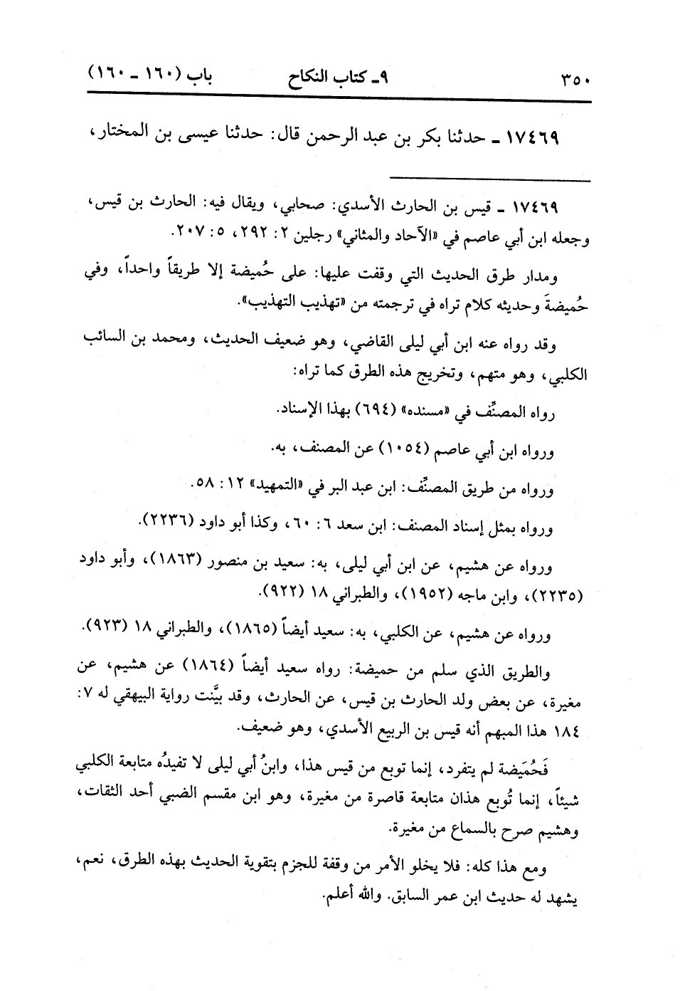 17469- حَدَّثَنَا بَكْرِ بْنُ عَبْدِ الرَّحْمَنِ , قَالَ : حدَّثَنَا عِيسَى بْنُ الْمُخْتَارِ , عَنِ ابْنِ أَبِي لَيْلَى , عَنْ حُمَيْضَةَ بْنِ الشَّمَرْدَلِ , عَنْ قَيْسِ بْنِ الْحَارِثِ الأَسَدِيِّ , أَنَّهُ أَسْلَمَ وَعِنْدَهُ ثَمَانِ نِسْوَةٍ , فَأَمَرَهُ رَسُولُ اللهِ صَلَّى الله عَلَيْهِ وَسَلَّمَ أَنْ يَخْتَارَ مِنْهُنَّ أَرْبَعًا. (4/318:2).