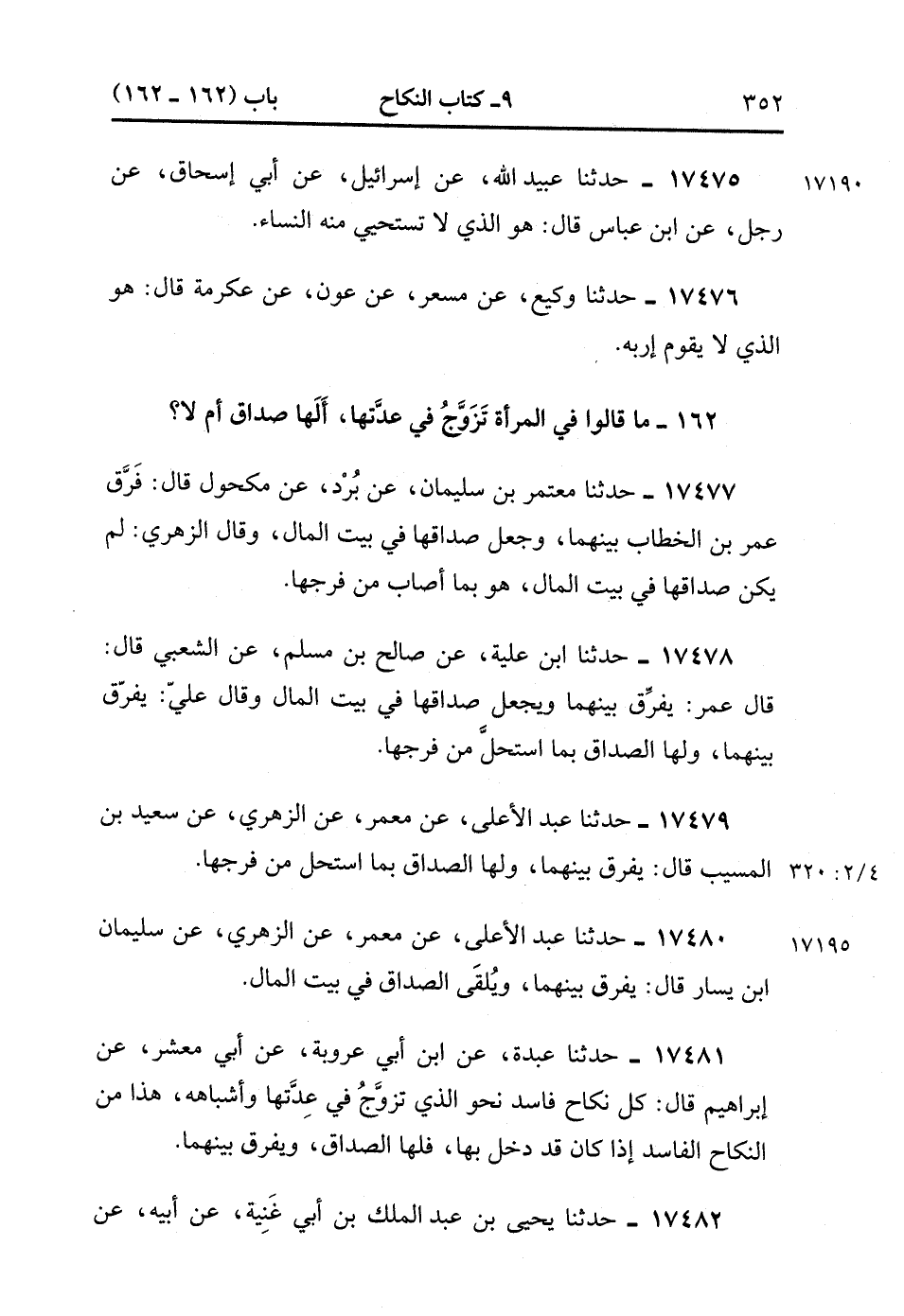 17481- حَدَّثَنَا عَبْدَةُ , عَنِ ابْنِ أَبِي عَرُوبَةَ , عَنْ أَبِي مَعْشَرٍ , عَنْ إبْرَاهِيمَ قَالَ : كُلُّ نِكَاحٍ فَاسِدٍ نَحْوَ الَّذِي تُزَوَّجُ فِي عِدَّتِهَا وَأَشْبَاهِهِ ، هَذَا مِنَ النِّكَاحِ الْفَاسِدِ إذَا كَانَ قَدْ دَخَلَ بِهَا فَلَهَا الصَّدَاقُ وَيُفَرَّقُ بَيْنَهُمَا. (4/320:2).
