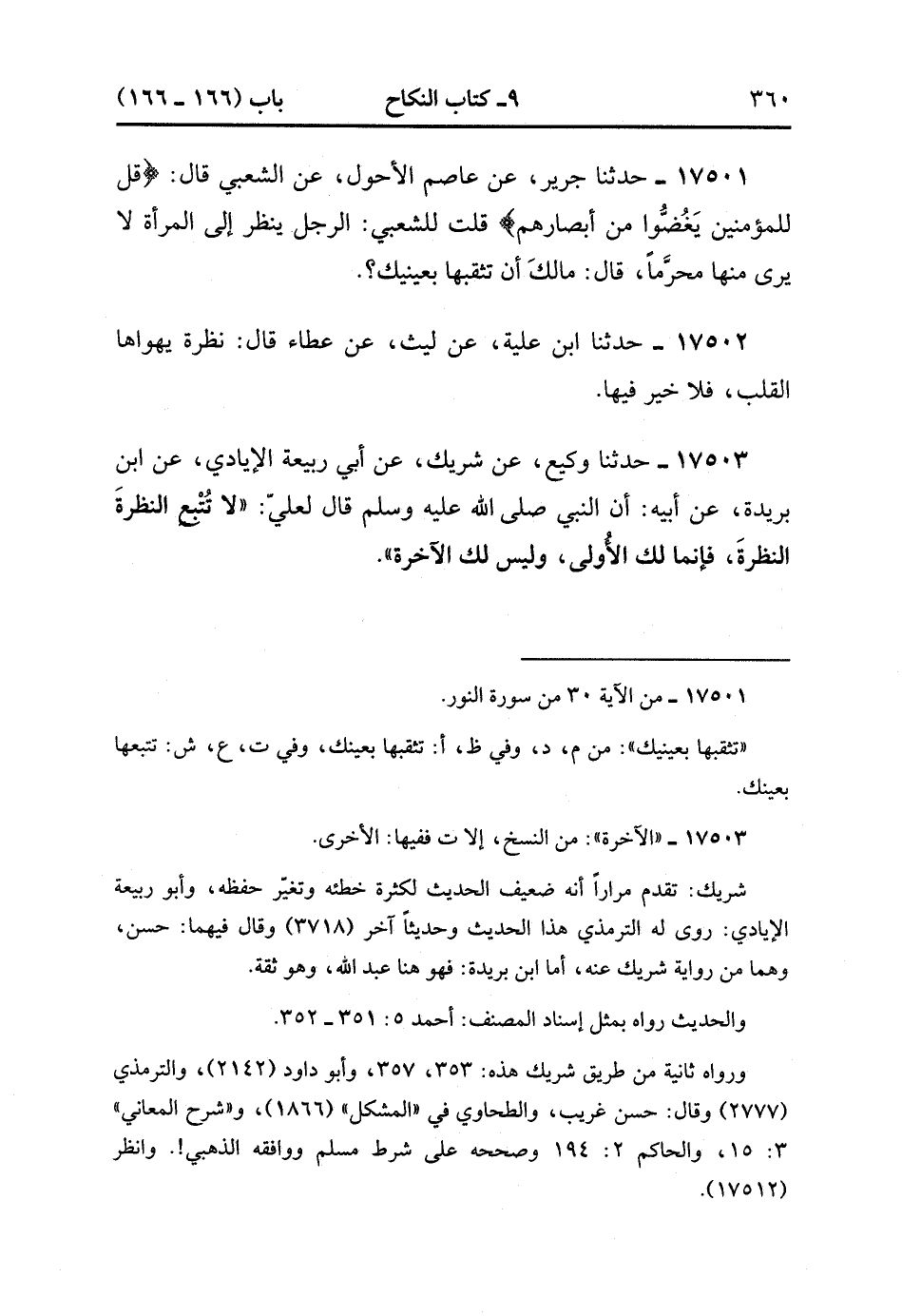 17503- حَدَّثَنَا وَكِيعٌ , عَنْ شَرِيكٍ , عَنْ أَبِي رَبِيعَةَ الإِيَادِيِّ , عَنِ ابْنِ بُرَيْدَةَ , عَنْ أَبِيهِ أَنَّ النَّبِيَّ صَلَّى الله عَلَيْهِ وَسَلَّمَ قَالَ لِعَلِيٍّ : لاَ تُتْبِعَ النَّظْرَةَ النَّظْرَةَ فَإِنَّمَا لَكَ الأُولَى وَلَيْسَ لَكَ الآخِرَةُ. (4/324:2).