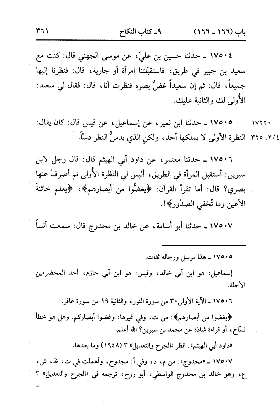 17507- حَدَّثَنَا أَبُو أُسَامَةَ , عَنْ خَالِدِ بْنِ مَحدُوجٍ ، قَالَ : سَمِعْتُ أَنَسًا يَقُولُ : إذَا لَقِيتِ الْمَرْأَةَ فَغُضَّ عَيْنَيكَ حَتَّى تَمْضِيَ. (4/325:2).