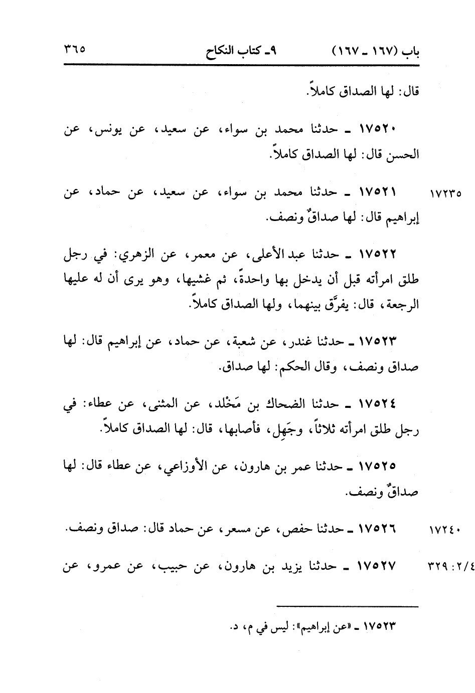 17526- حَدَّثَنَا حَفْصٌ , عَنْ مِسْعَرٍ , عَنْ حَمَّادٍ قَالَ : صَدَاقٌ وَنِصْفُ.