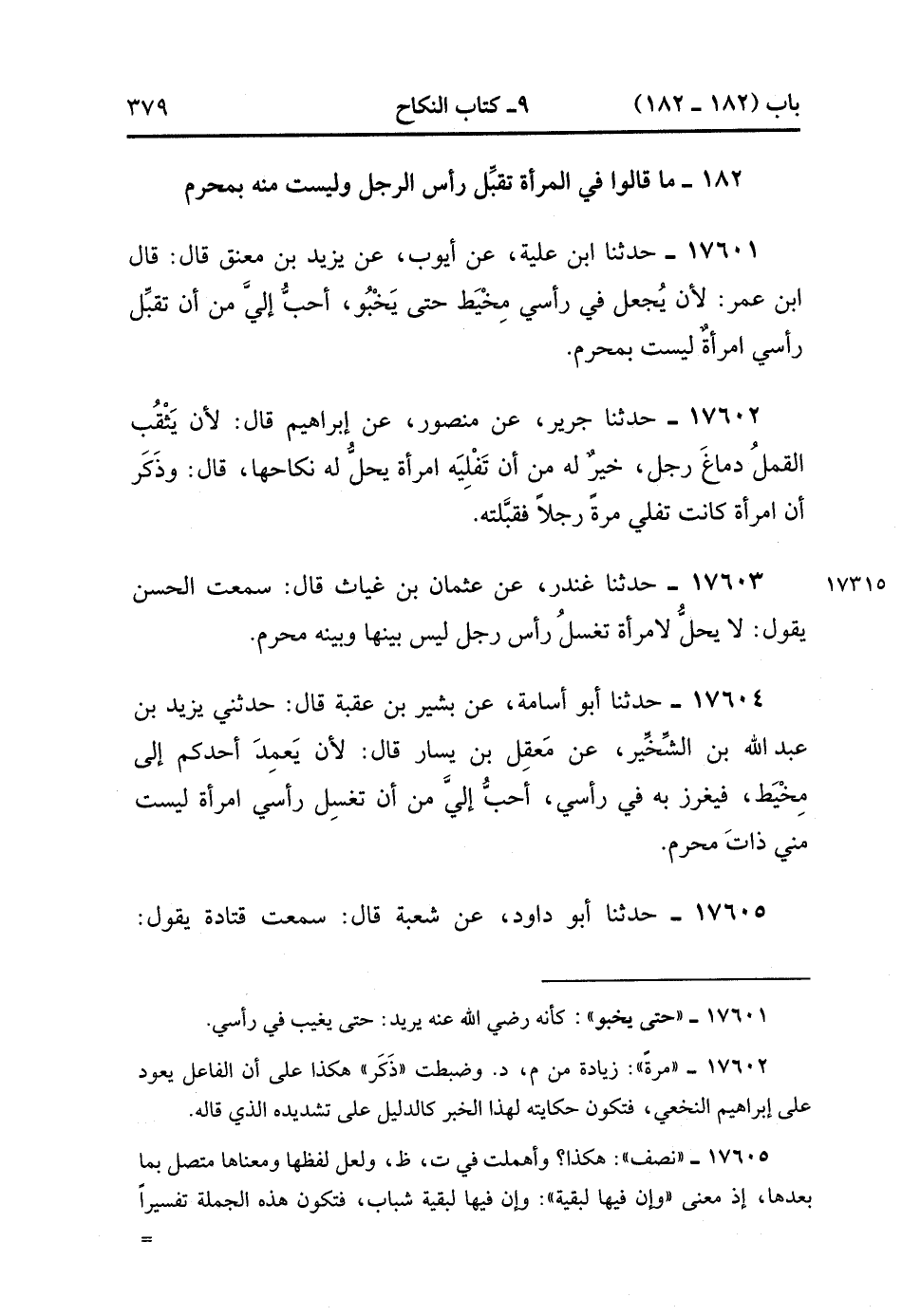 182 - مَا قَالُوا فِي الْمَرْأَةِ تُقَبِّلُ رَأْسَ الرَّجُلِ وَلَيْسَتْ مِنْهُ بِمَحْرَمٍ.