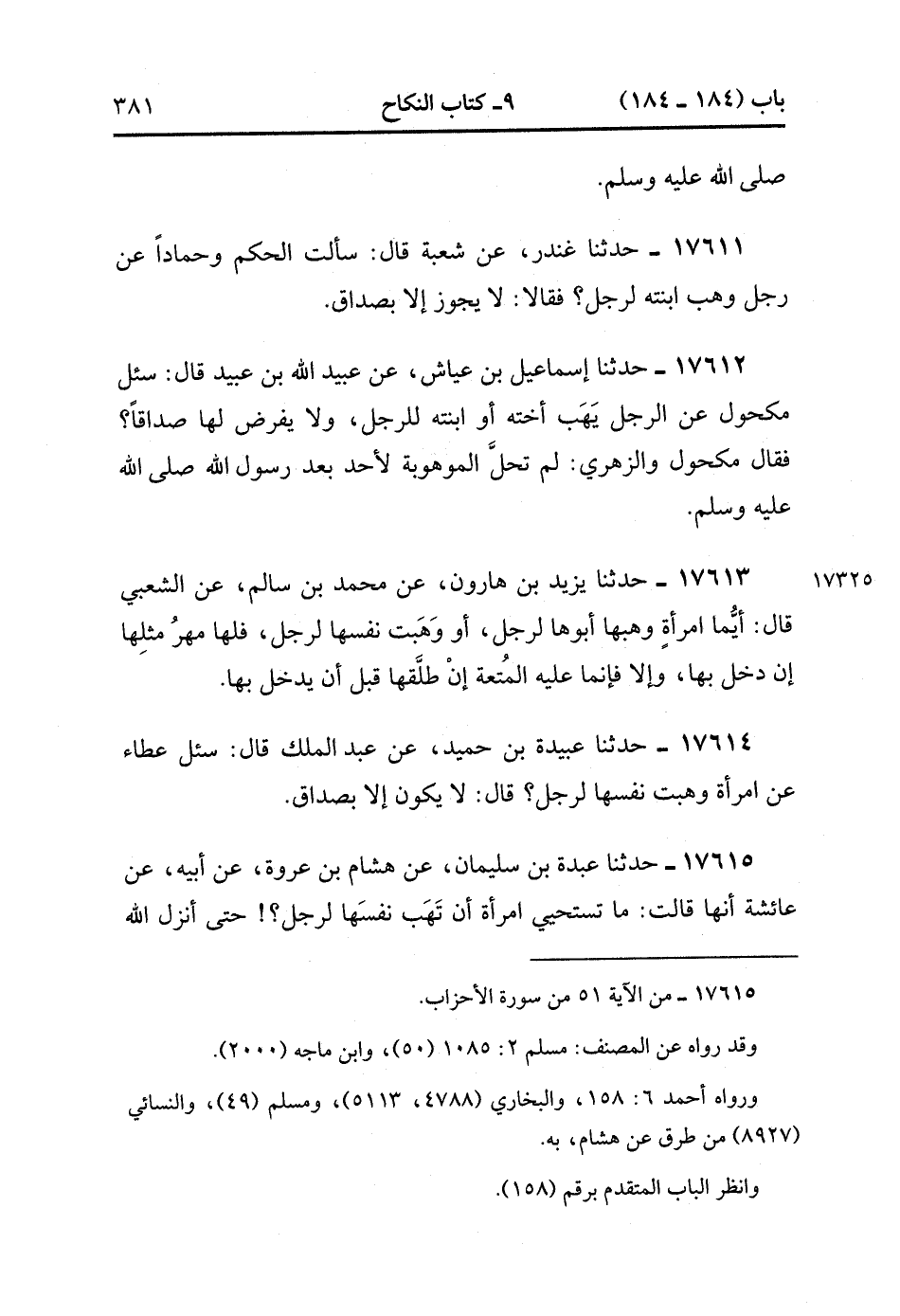 17611- حَدَّثَنَا غُنْدَرٌ , عَنْ شُعْبَةَ قَالَ : سَأَلْتُ الْحَكَمَ وَحَمَّادًا , عَنْ رَجُلٍ وَهَبَ ابْنَتَهُ لِرَجُلٍ فَقَالاَ : لاَ يَجُوزُ إلاَّ بِصَدَاقٍ.