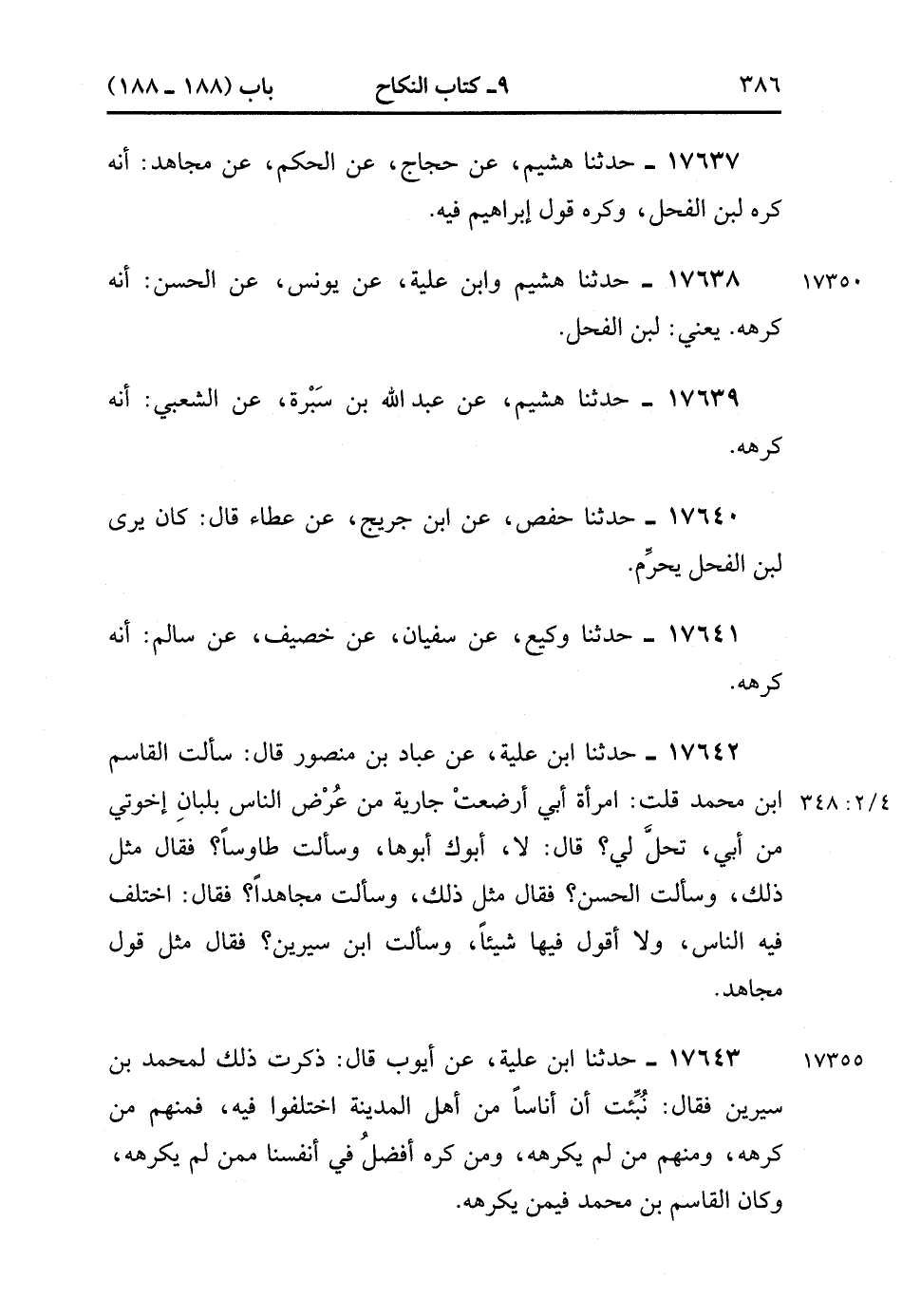 17642- حَدَّثَنَا ابْنُ عُلَيَّةَ , عَنْ عَبَّادِ بْنِ مَنْصُورٍ قَالَ : سَأَلْتُ الْقَاسِمَ بْنَ مُحَمَّدٍ : قُلْتُ امْرَأَة أَبِي أَرْضَعَتْ جَارِيَةً مِنْ عَرَضِ النَّاسِ بِلِبَانِ إخْوَتِي مِنْ أَبِي ، تَحِلُّ لِي ؟ قَالَ : لاَ ، أَبُوك أَبُوهَا ، وَسَأَلْت طَاوُوسًا , فَقَالَ مِثْلَ ذَلِكَ وَسَأَلْت الْحَسَنَ , فَقَالَ مِثْلَ ذَلِكَ وَسَأَلْت مُجَاهِدًا , فَقَالَ : اخْتَلَفَ فِيهِ النَّاسُ وَلاَ أَقُولُ فِيهَا شَيْئًا وَسَأَلْت ابْنَ سِيرِينَ , فَقَالَ مِثْلَ قَوْلِ مُجَاهِدٍ. (4/347:2)