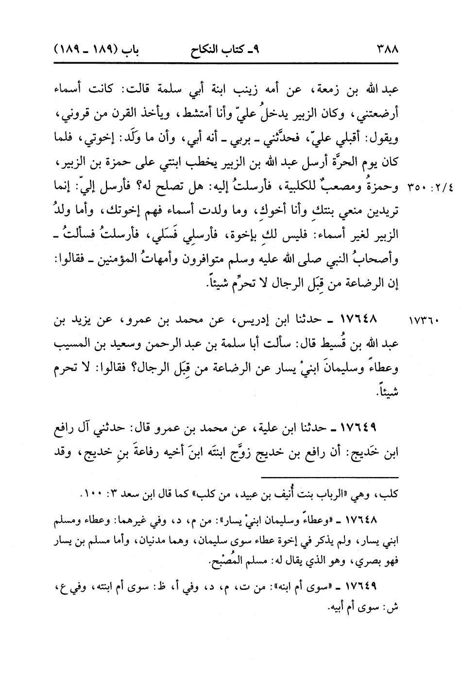 17649- حَدَّثَنَا ابْنُ عُلَيَّةَ , عَنْ مُحَمَّدِ بْنِ عَمْرٍو قَالَ : حدَّثَنِي آل رَافِعِ بْنِ خَدِيجٍ أَنَّ رَافِعَ بْنَ خَدِيجٍ زَوَّجَ ابْنَتَهُ ابْنَ أَخِيهِ رِفَاعَةَ بْنِ خَدِيجٍ وَقَدْ أَرْضَعَتْهَا أُمُّ وَلَدٍ لَهُ سِوَى أُمِّ اَبنهِ الَّذِي أَنْكَحَهَا إيَّاهُ. (4/350:2).