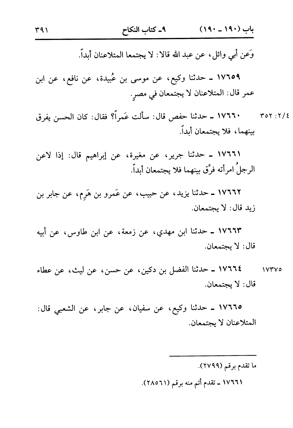 17665- حَدَّثَنَا وَكِيعٌ , عَنْ سُفْيَانَ , عَنْ جَابِرٍ , عَنِ الشَّعْبِيِّ قَالَ : الْمُتَلاَعِنَانِ لاَ يَجْتَمِعَانِ. (4/352:2).