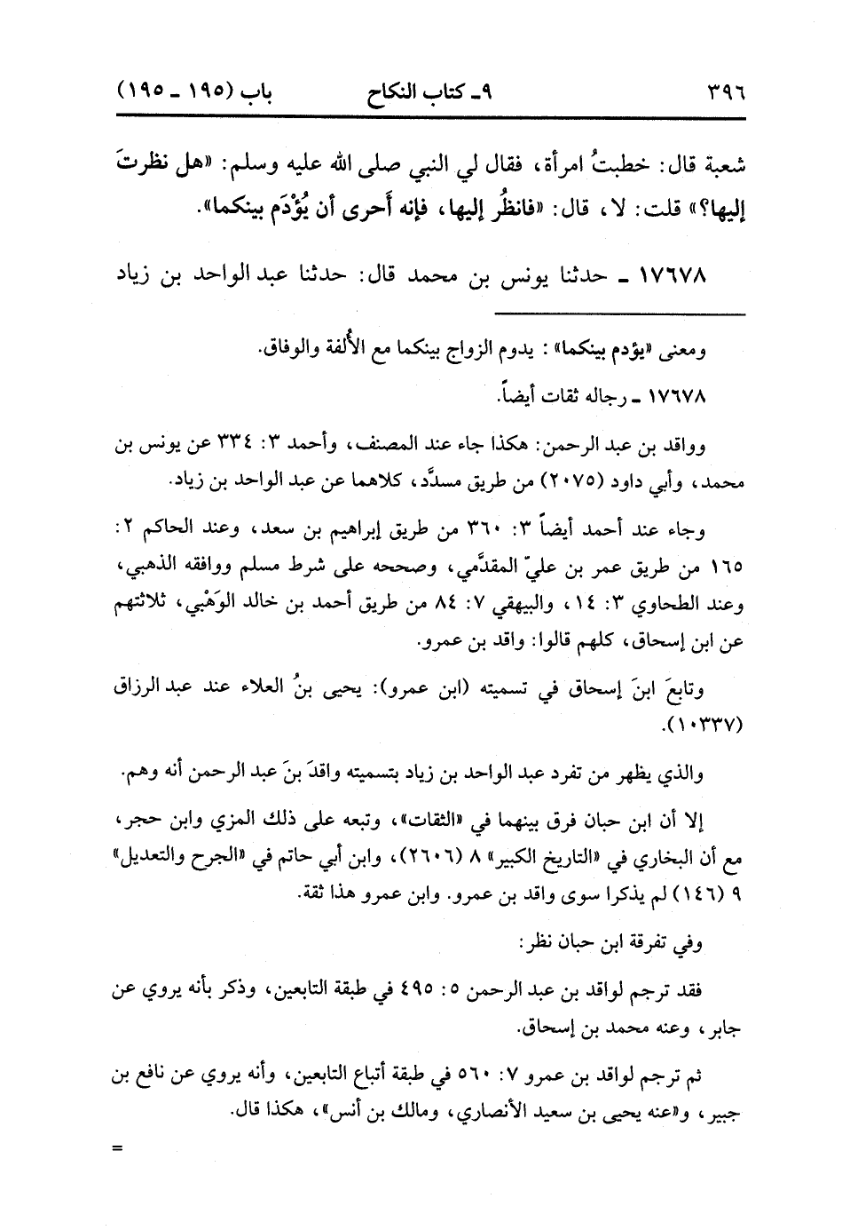 17678- حَدَّثَنَا يُونُسُ بن مُحَمَّدٍ , قَالَ : حدَّثَنَا عَبْدُ الْوَاحِدِ بْنِ زِيَاد قَالَ : حَدَّثَنَا مُحَمَّدُ بْنُ إِسْحَاقَ , عَنْ دَاوُدَ بْنِ الْحُصَيْنِ , عَنْ وَاقِدِ بْنِ عَبْدِ الرَّحْمَنِ بْنِ سَعْدِ بْنِ مُعَاذٍ , عَنْ جَابِرِ بْنِ عَبْدِ اللهِ ، قَالَ : قَالَ رَسُولُ اللهِ صَلَّى الله عَلَيْهِ وَسَلَّمَ : إذَا خَطَبَ أَحَدُكُمَ امْرَأَةً فَإِنَ اسْتَطَاعَ أَنْ يَنْظُرَ مِنْهَا إلَى مَا يَدْعُوهُ إلَى نِكَاحِهَا فَلْيَفْعَلْ فَخَطَبْت جَارِيَةً مِنْ بَنِي سَلِمَةَ فَكُنْت أَتَخَبَّأُ تَحْتَ الْكَرَبِ حَتَّى نَظَرْت مِنْهَا إلَى مَا يَدْعُونِي إلَى نِكَاحِهَا فَتَزَوَّجْتهَا. (4/355:2).