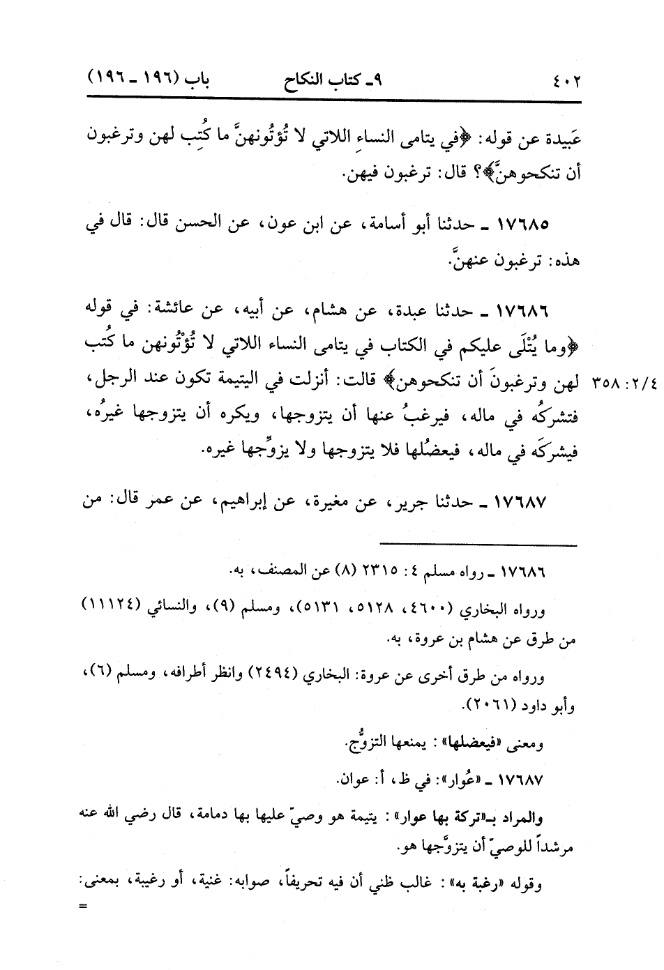 17686- حَدَّثَنَا عَبْدَةُ , عَنْ هِشَامٍ , عَنْ أَبِيهِ , عَنْ عَائِشَةَ فِي قَوْلِهِ : {وَمَا يُتْلَى عَلَيْكُمْ فِي الْكِتَابِ فِي يَتَامَى النِّسَاءِ اللاَّتِي لاَ تُؤْتُونَهُنَّ مَا كُتِبَ لَهُنَّ وَتَرْغَبُونَ أَنْ تَنْكِحُوهُنَّ} قَالَتْ : أُنْزِلَتْ فِي الْيَتِيمَةِ تَكُونُ عِنْدَ الرَّجُلِ فَتَشْرَكُهُ فِي مَالِهِ فَيَرْغَبُ عَنْها أَنْ يَتَزَوَّجَهَا وَيَكْرَهَ أَنْ يَتَزَوَّجَهَا غَيْرُهُ فَيَشْرَكَهُ فِي مَالِهِ فَيَعْضُلَهَا فَلاَ يَتَزَوَّجُهَا وَلاَ يُزَوِّجُهَا غَيْرَهُ. (4/357:2)