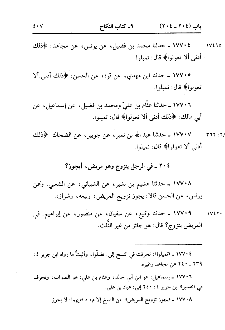17709- حَدَّثَنَا وَكِيعٌ , عَنْ سُفْيَانَ , عَنْ مَنْصُورٍ , عَنْ إبْرَاهِيمَ فِي الْمَرِيضِ هُوَ يَتَزَوَّجُ ؟ قَالَ : هُوَ جَائِزٌ مِنْ غَيْرِ الثَّلاَثِ. (4/362:2).