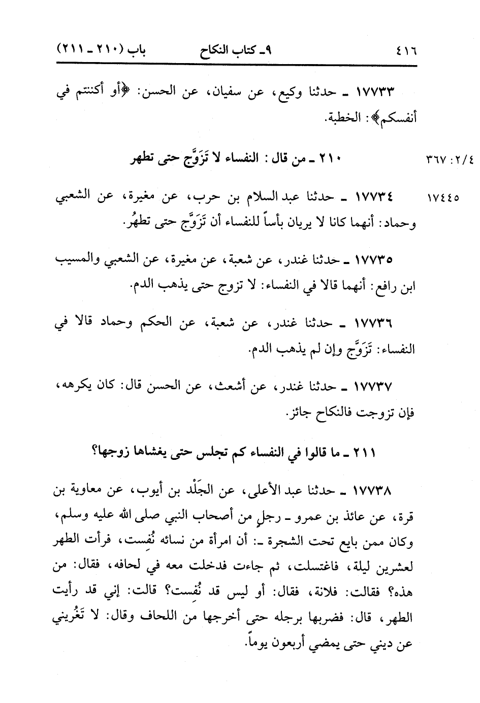 17735- حَدَّثَنَا غُنْدَرٌ , عَنْ شُعْبَةَ , عَنْ مُغِيرَةَ , عَنِ الشَّعْبِيِّ وَالْمُسَيَّبِ بْنِ رَافِعٍ أَنَّهُمَا قَالاَ فِي النُّفَسَاءِ : لاَ تُزَوَّجُ حَتَّى يَذْهَبَ الدَّمُ.