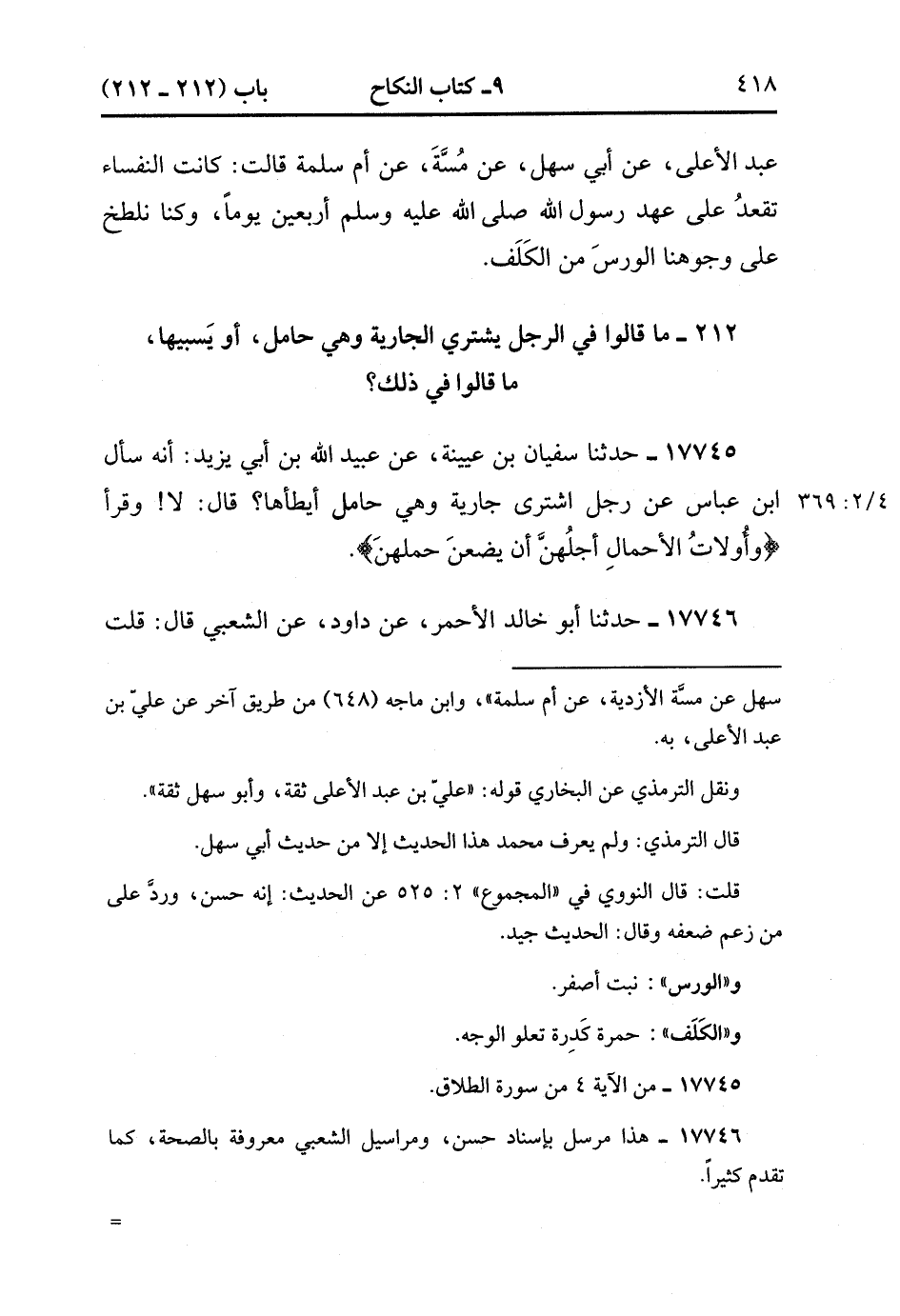 17745- حَدَّثَنَا سُفْيَانُ بْنُ عُيَيْنَةَ , عَنْ عُبَيْدِ اللهِ بْنِ أَبِي يَزِيدَ أَنَّهُ سَأَلَ ابْنَ عَبَّاسٍ عَنْ رَجُلٍ اشْتَرَى جَارِيَةً وَهِيَ حَامِلٌ أَيَطَأَهَا ؟ قَالَ : لاَ ، وَقَرَأَ : {وَأُولاَتُ الأَحْمَالِ أَجَلُهُنَّ أَنْ يَضَعْنَ حَمْلَهُنَّ}. (4/368:2).