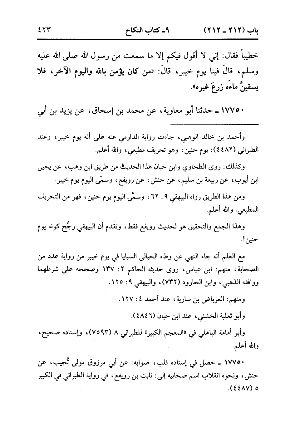 17750- حَدَّثَنَا أَبُو مُعَاوِيَةَ , عَنْ مُحَمَّدِ بْنِ إِسْحَاقَ , عَنْ يَزِيدَ بْنِ أَبِي حَبِيبٍ , عَنْ حَنَشٍ الصَّنْعَانِيِّ , عَنْ أَبِي مَرْزُوقٍ ، مَوْلَى تُجِيبَ (1) , عَنْ رُوَيْفِعِ بْنِ ثَابِتٍ , عَنِ النَّبِيِّ صَلَّى الله عَلَيْهِ وَسَلَّمَ بِمِثْلِهِ. (4/369:2).