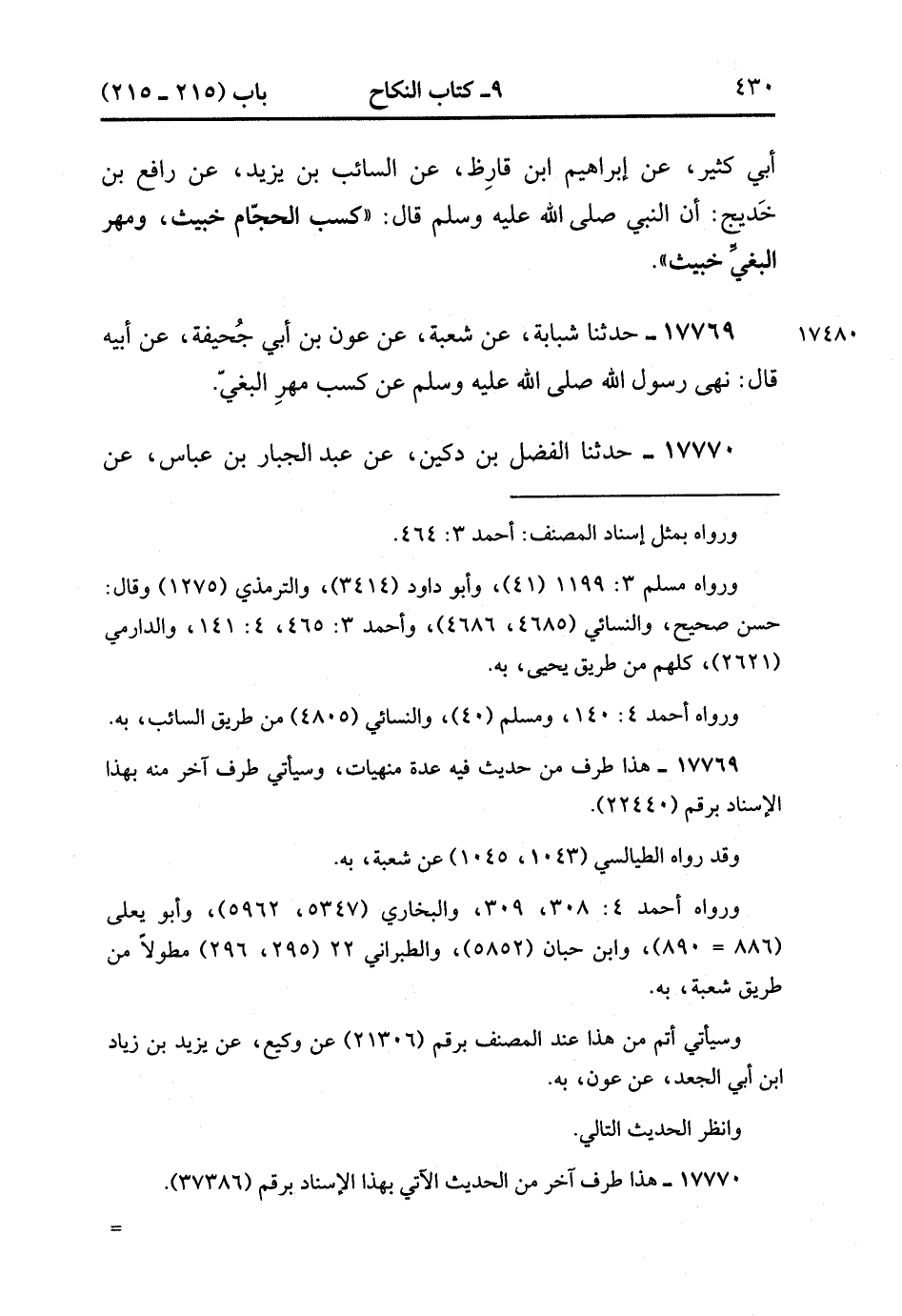 17770- حَدَّثَنَا الْفَضْلُ بْنُ دُكَيْنٍ , عَنْ عَبْدِ الْجَبَّارِ بْنِ عَبَّاسٍ , عَنْ عَوْنِ بْنِ أَبِي جُحَيْفَةَ , عَنْ أَبِيهِ قَالَ : نَهَى رَسُولُ اللهِ صَلَّى الله عَلَيْهِ وَسَلَّمَ عَنْ مَهْرِ الْبَغِيِّ. (4/375:2).
