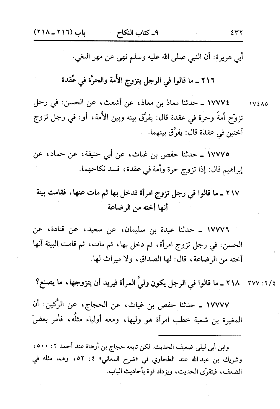 17774- حَدَّثَنَا مُعَاذُ بنُ مُعَاذٍ , عَنْ أَشْعَثَ , عَنِ الحَسَنِ فِي رَجُلٍ تَزَوَّجَ أَمَةً وَحُرَّةً فِي عُقْدَةٍ قَالَ : يُفَرَّقُ بَيْنَهُ وَبَيْنَ الأَمَةِ ، أَوْ فِي رَجُلٍ تَزَوَّجَ أُخْتَيْنِ فِي عُقْدَةٍ قَالَ : يُفَرَّقُ بَيْنَهُمَا.