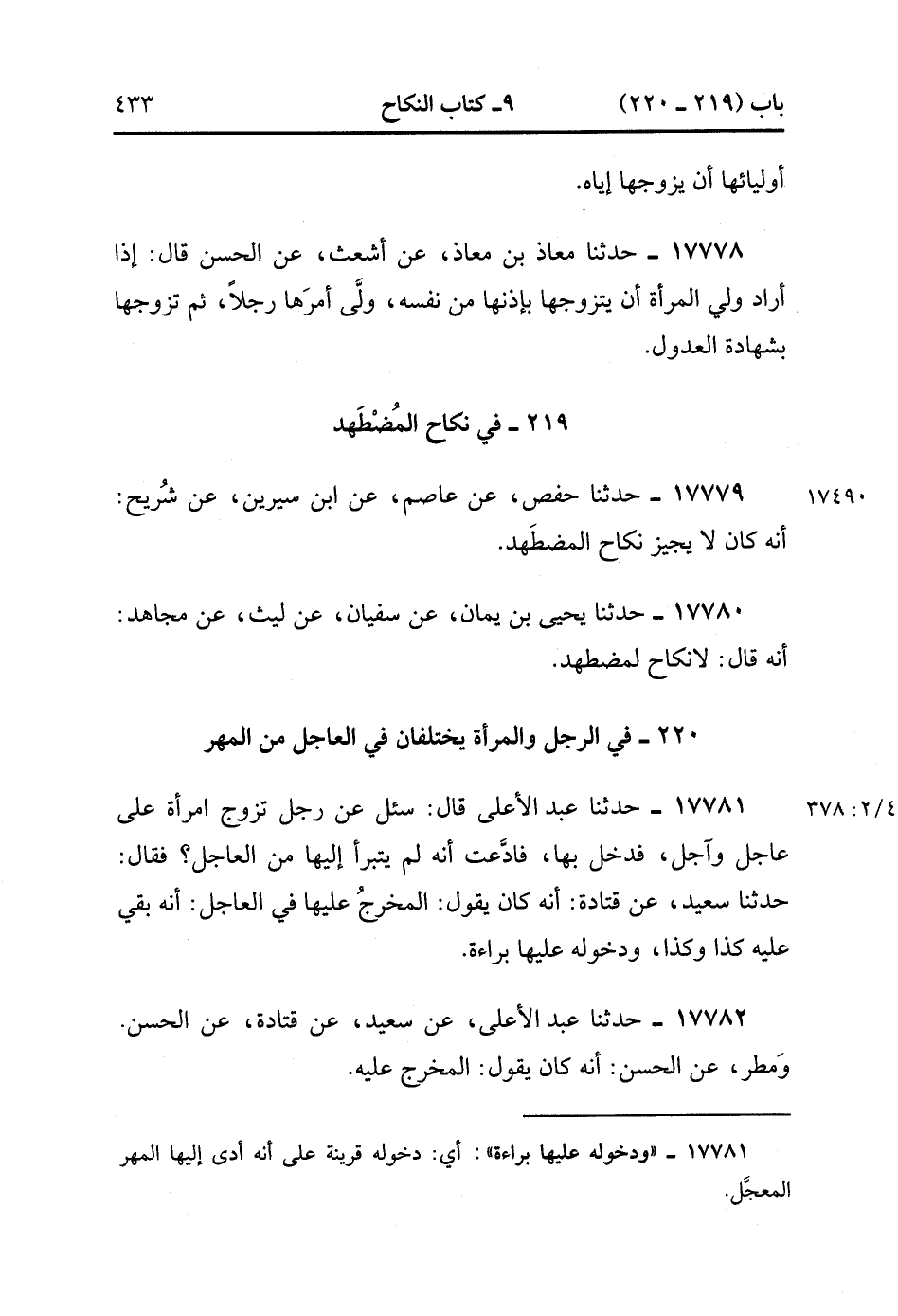 17781- حَدَّثَنَا عَبْدُ الأَعْلَى قَالَ : سُئِلَ عَنْ رَجُلٍ تَزَوَّجَ امْرَأَةً عَلَى عَاجِلٍ أَوْ آجِلٍ فَدَخَلَ بِهَا فَادَّعَتْ أنَّهُ لَمْ يَِبَِرأ إِلِيْهَا مِنَ العَاجِلِ فَقَالَ : حَدَّثَنَا سَعِيدٍ , عَنْ قَتَادَةَ أَنَّهُ كَانَ يَقُوْلُ : المَخْرَجُ عَلَيْهَا فِيَ العَاجِلِ ، أَنَّهُ بَقِيَ عَلَيْهِ كَذَا وكَذَا وَدُخُوْلُهُ عَلَيْهَا أَبْرَأَهُ. (4/377:2)