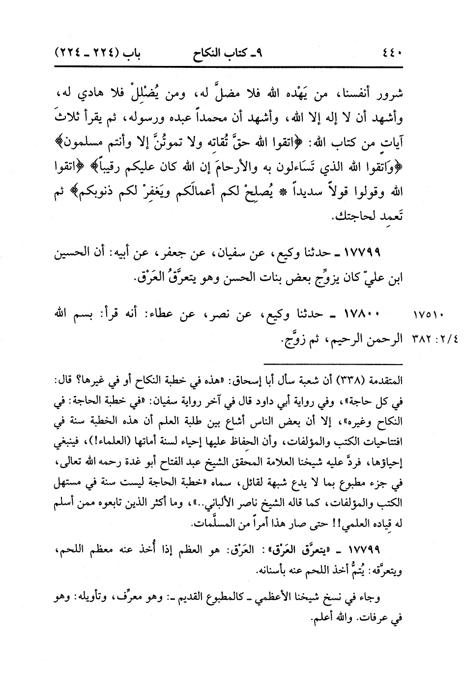 17799- حَدَّثَنَا وَكِيعٌ , عَنْ سُفْيَانَ , عَنْ جَعْفَرٍ , عَنْ أَبِيهِ أَنَّ الْحُسَيْنَ بْنَ عَلِيٍّ كَانَ يُزَوِّجُ بَعْضَ بَنَاتِ الْحَسَنِ وَهُوَ يتعرق العرق.