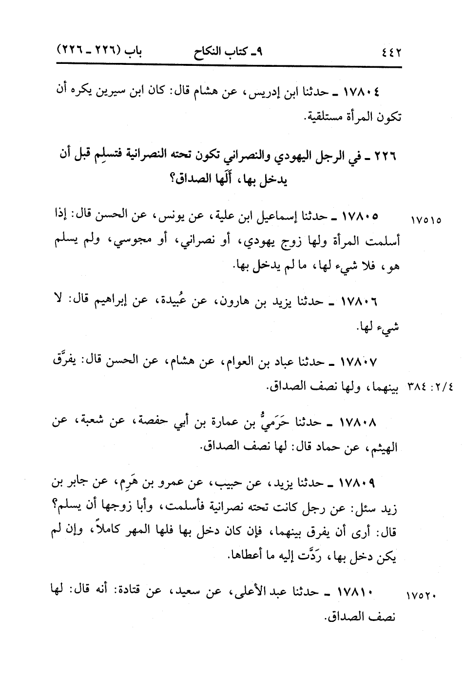 17805- حَدَّثَنَا إسْمَاعِيلُ ابْنُ عُلَيَّةَ , عَنْ يُونُسَ , عَنِ الْحَسَنِ قَالَ : إذَا أَسْلَمَتِ الْمَرْأَةُ وَلَهَا زَوْجٌ يَهُودِيٌّ ، أَوْ نَصْرَانِيٌّ ، أَوْ مَجُوسِيٌّ , وَلَمْ يُسْلِمْ هُوَ فَلاَ شَيْءَ لَهَا مَا لَمْ يَدْخُلْ بِهَا.