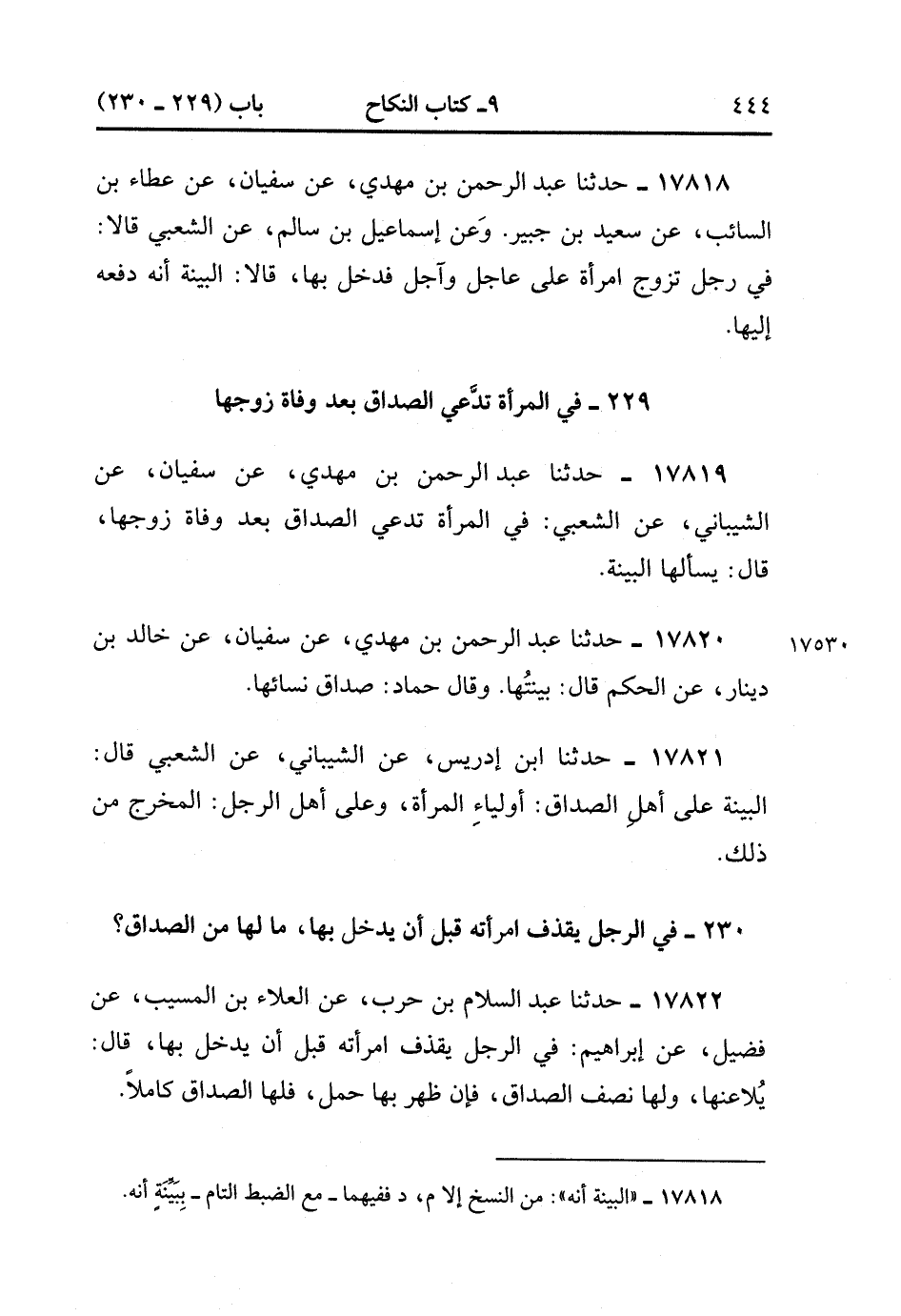 17822- حدَّثَنَا عَبْدُ السَّلاَمِ بْنُ حَرْبٍ , عَنِ الْعَلاَءِ بْنِ الْمُسَيَّبِ , عَنِ الْفُضَيْلِ , عَنْ إبْرَاهِيمَ فِي الرَّجُلِ يَقْذِفُ امْرَأَتَهُ قَبْلَ أَنْ يَدْخُلَ بِهَا قَالَ : يُلاَعِنُهَا وَلَهَا نِصْفُ الصَّدَاقِ فَإِنْ ظَهَرَ بِهَا حَمْلٌ فَلَهَا الصَّدَاقُ كَامِلاً. (4/385:2).