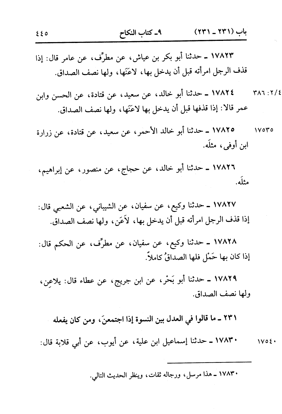 17829- حَدَّثَنَا أَبُو بَحْرٍ , عَنِ ابْنِ جُرَيْجٍ , عَنْ عَطَاءٍ قَالَ : يُلاَعِنُ وَلَهَا نِصْفُ الصَّدَاقِ. (4/386:2).