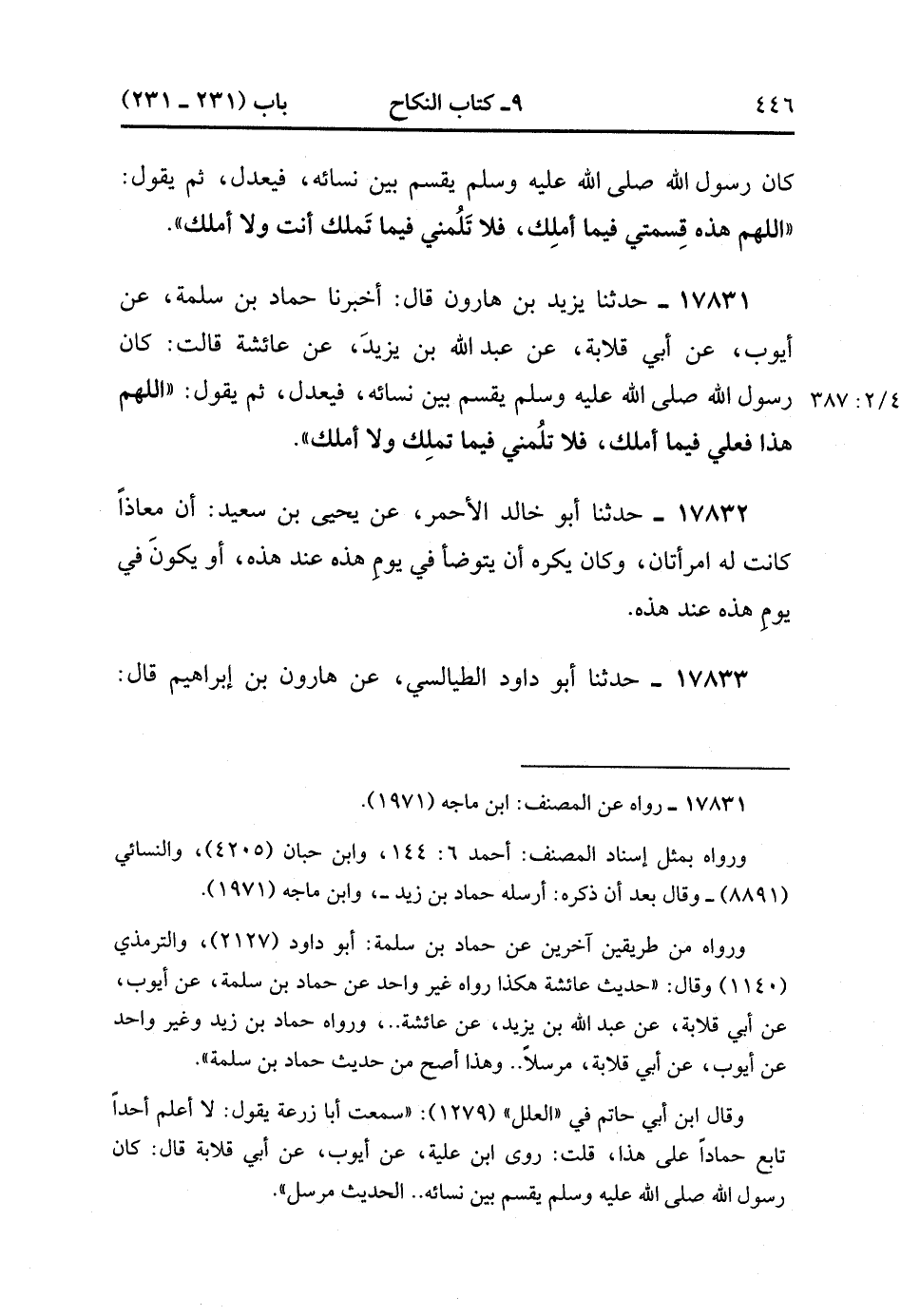 17831- حَدَّثَنَا يَزِيدُ بْنُ هَارُونَ , قَالَ : أَخْبَرَنَا حَمَّادُ بْنُ سَلَمَةَ , عَنْ أَيُّوبَ , عَنْ أَبِي قِلاَبَةَ , عَنْ عَبْدِ اللهِ بْنِ يَزِيدَ , عَنْ عَائِشَةَ قَالَتْ : كَانَ رَسُولُ اللهِ صَلَّى الله عَلَيْهِ وَسَلَّمَ يَقْسِمُ بَيْنَ نِسَائِهِ فَيَعْدِلُ ثُمَّ يَقُولُ : اللَّهُمَّ هَذَا فِعْلِي فِيمَا أَمْلِكُ فَلاَ تَلُمْنِي فِيمَا تَمْلِكُ وَلاَ أَمْلِكُ. (4/386:2)