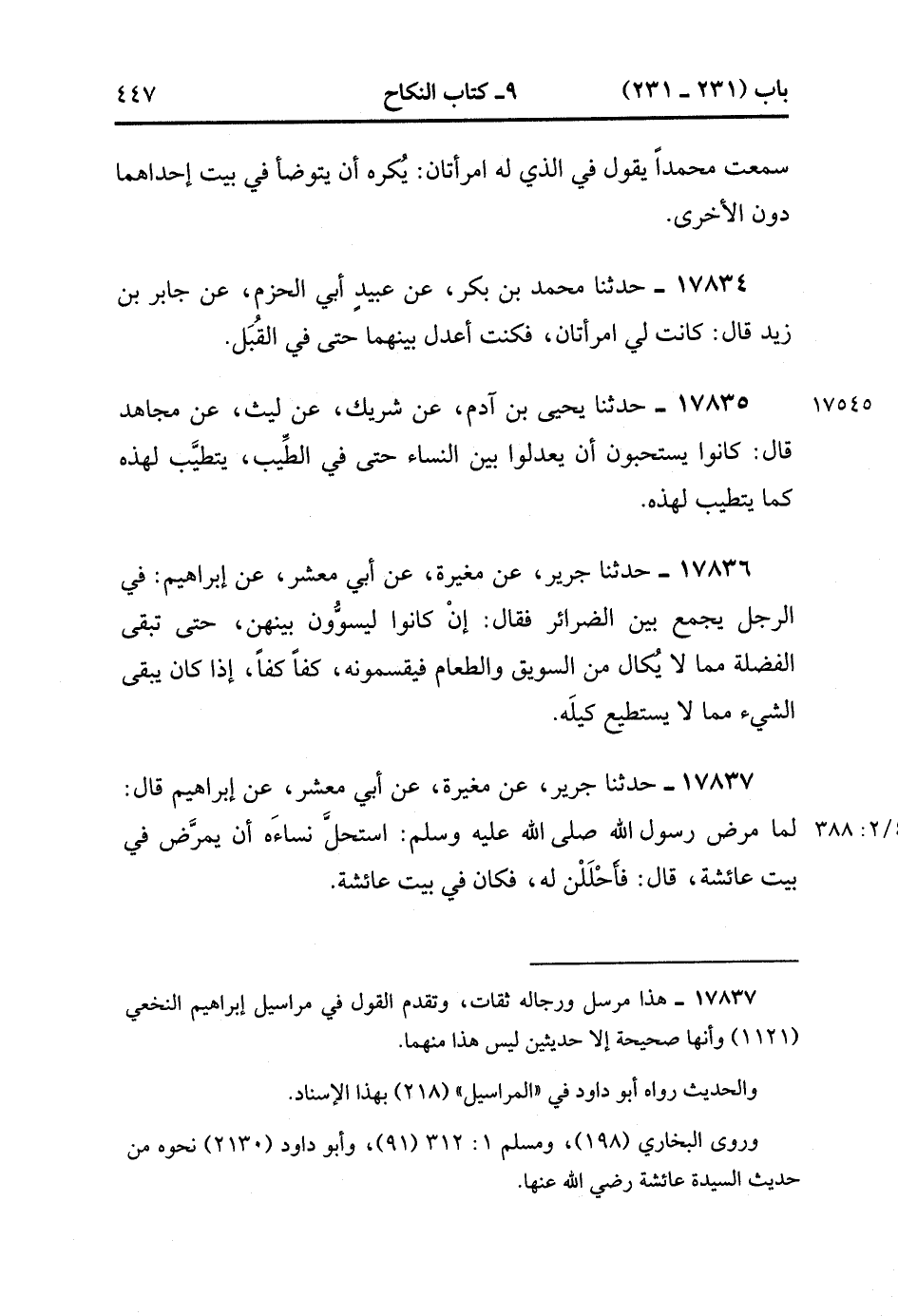 17834- حَدَّثَنَا مُحَمَّدُ بْنُ بكر , عَنْ عُبَيْدٍ أَبِي الْحَزمِ , عَنْ جَابِرِ بْنِ زَيْدٍ قَالَ : كَانَتْ لِي امْرَأَتَانِ فَكُنْت أَعْدِلُ بَيْنَهُمَا حَتَّى فِي الْقُبَلِ.