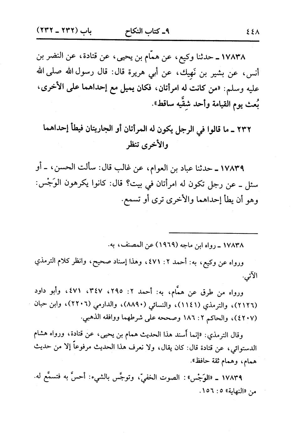 17838- حَدَّثَنَا وَكِيعٌ , عَنْ هَمَّامِ بْنِ يَحْيَى , عَنْ قَتَادَةَ , عَنِ النَّضْرِ بْنِ أَنَسٍ , عَنْ بَشِيرِ بْنِ نَهِيكٍ , عَنْ أَبِي هُرَيْرَةَ ، قَالَ : قَالَ رَسُولُ اللهِ صَلَّى الله عَلَيْهِ وَسَلَّمَ : مَنْ كَانَت لَهُ امْرَأَتَانِ ، فَكَانَ يَمِيلُ مَعَ إحْدَاهُمَا عَلَى الأُخْرَى بُعِثَ يَوْمَ الْقِيَامَةِ وَأَحَدُ شِقَّيْهِ سَاقِطٌ.