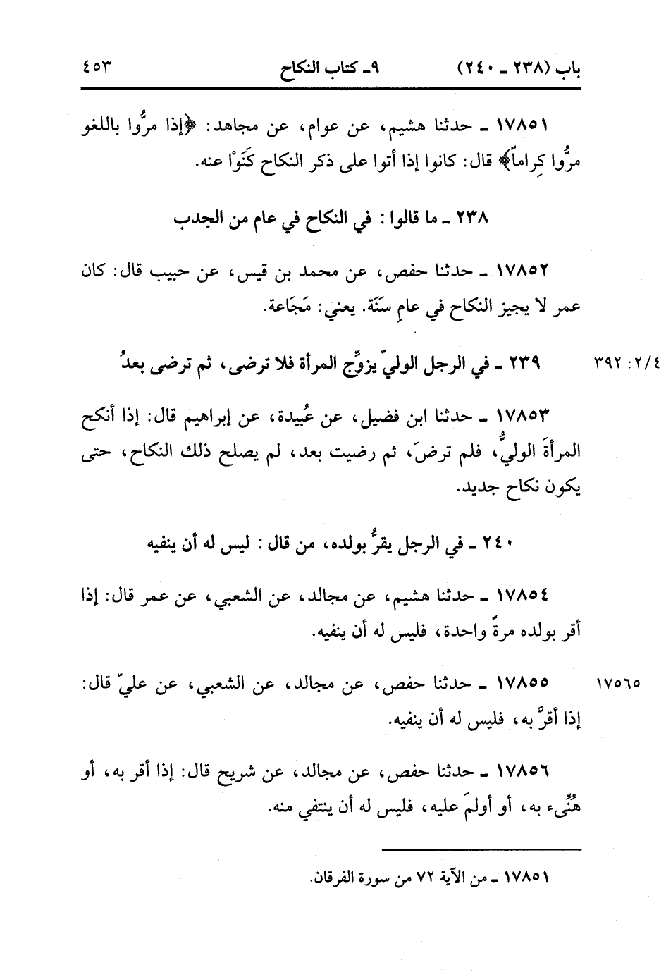 17851- حَدَّثَنَا هُشَيْمٌ , عَنْ عَوَّامٍ , عَنْ مُجَاهِدٍ : {وَإِذَا مَرُّوا بِاللَّغْوِ مَرُّوا كِرَامًا} قَالَ : كانوا إذَا أَتَوْا عَلَى ذِكْرِ النِّكَاحِ كَنَوْا عَنْهُ.