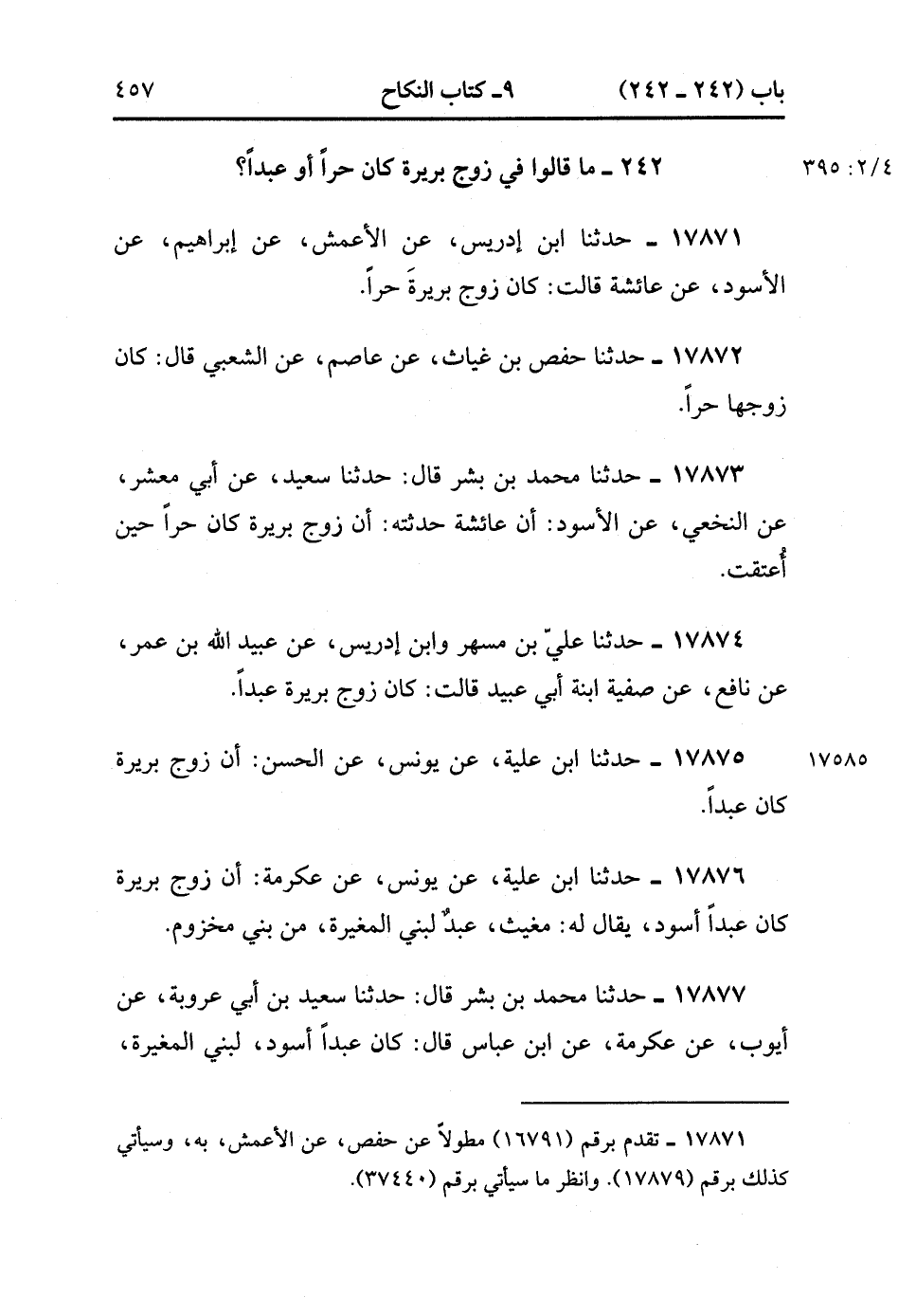 17871- حَدَّثَنَا ابْنُ إدْرِيسَ , عَنِ الأَعْمَشِِ , عَنْ إبْرَاهِيمَ , عَنِ الأَسْوَدِ , عَنْ عَائِشَةَ قَالَتْ : كَانَ زَوْجُ بَرِيرَةَ حُرًّا.