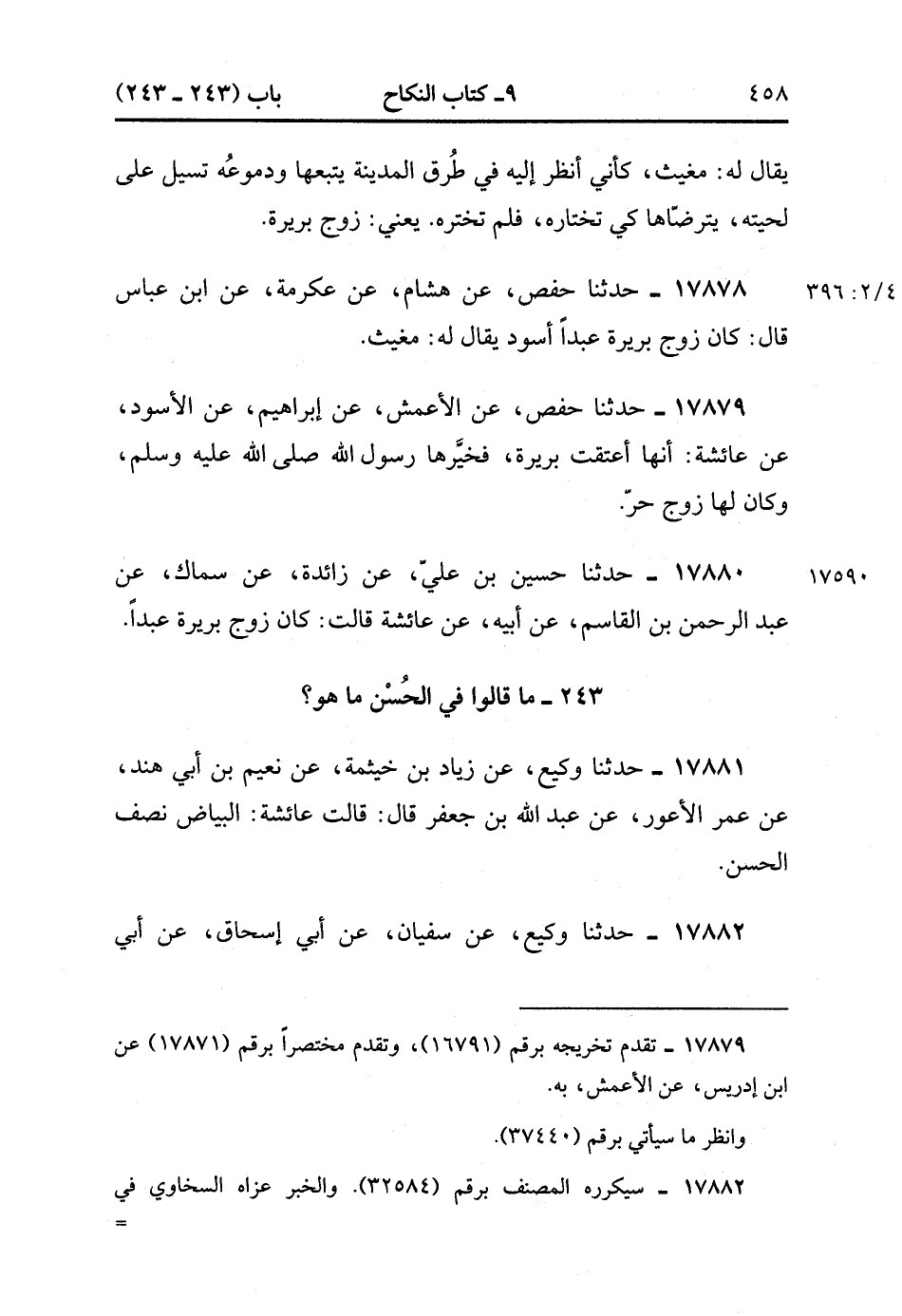 17879- حَدَّثَنَا حَفْصٌ , عَنِ الأَعْمَشِِ , عَنْ إبْرَاهِيمَ , عَنِ الأَسْوَدِ , عَنْ عَائِشَةَ أَنَّهَا أَعْتَقَتْ بَرِيرَةَ فَخَيَّرَهَا رَسُولُ اللهِ صَلَّى الله عَلَيْهِ وَسَلَّمَ ، وَكَانَ لَهَا زَوْجٌ حُرٌّ.