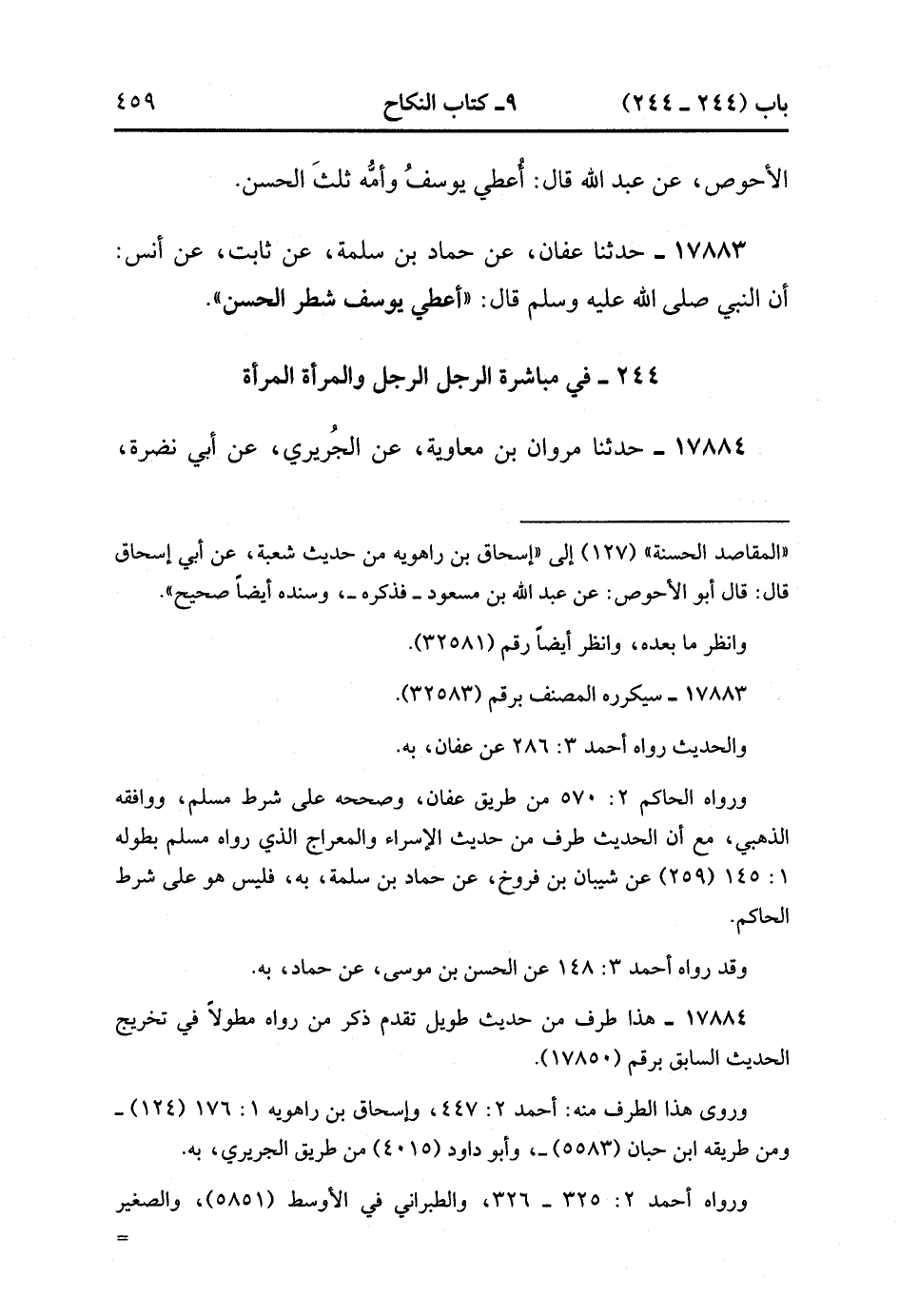 17883- حَدَّثَنَا عَفَّانُ , عَنْ حَمَّادِ بْنِ سَلَمَةَ , عَنْ ثَابِتٍ , عَنْ أَنَسٍ أَنَّ النَّبِيَّ صَلَّى الله عَلَيْهِ وَسَلَّمَ قَالَ : أُعْطِيَ يُوسُفُ شَطْرَ الْحُسْنِ. (4/396:2).
