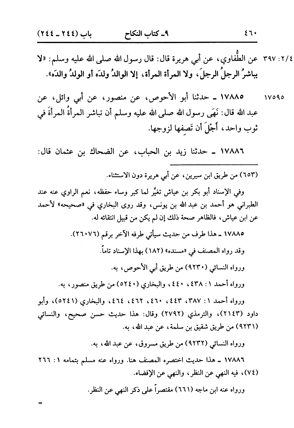 17885- حَدَّثَنَا أَبُو الأَحْوَصِِ , عَنْ مَنْصُورٍ , عَنْ أَبِي وَائِلٍ , عَنْ عبد اللهِ قَالَ : نَهَى رَسُولُ اللهِ صَلَّى الله عَلَيْهِ وَسَلَّمَ أَنْ تُبَاشِرَ الْمَرْأَةُ الْمَرْأَةَ فِي ثَوْبٍ وَاحِدٍ أَجْلَ أَنْ تَصِفَهَا لِزَوْجِهَا. (4/397:2).